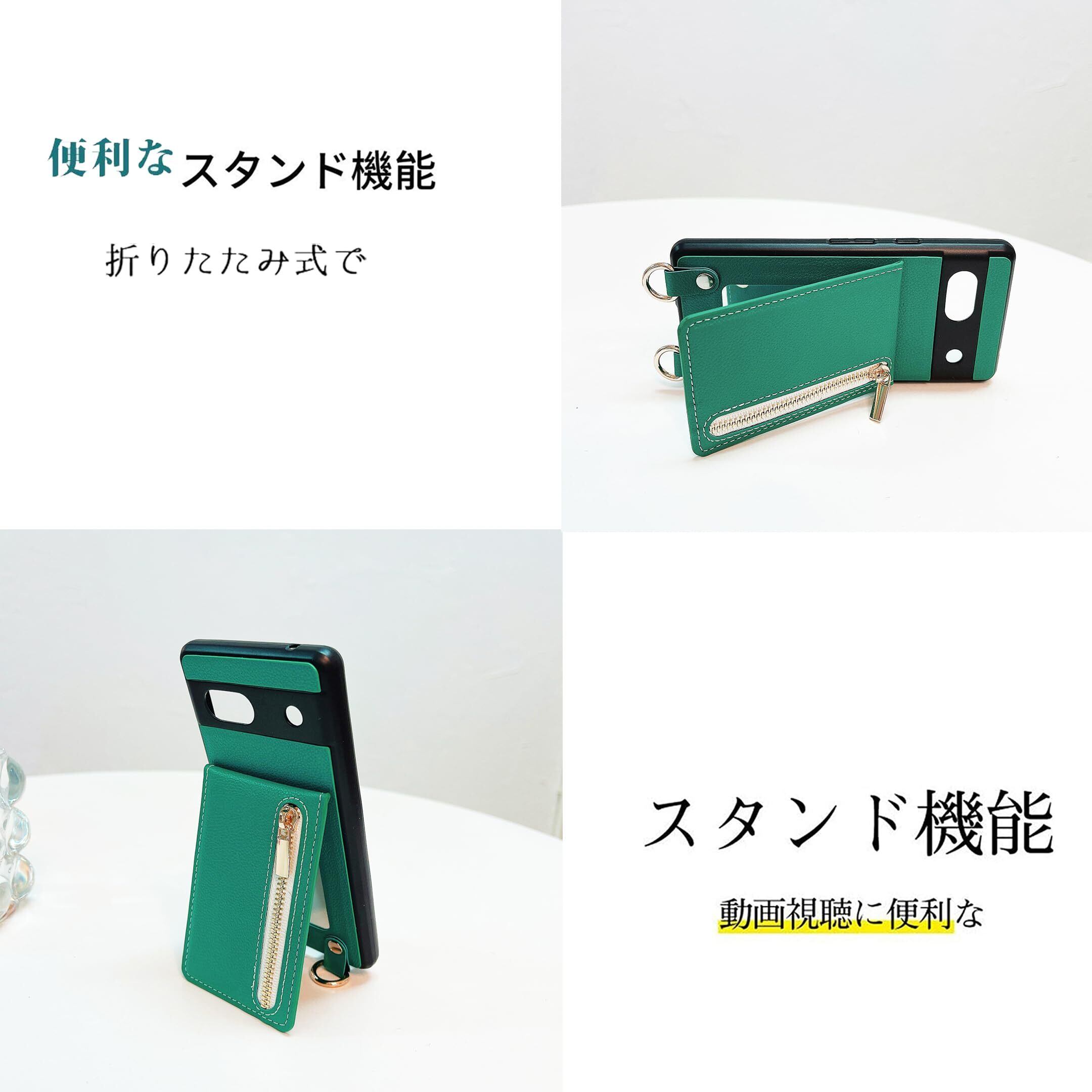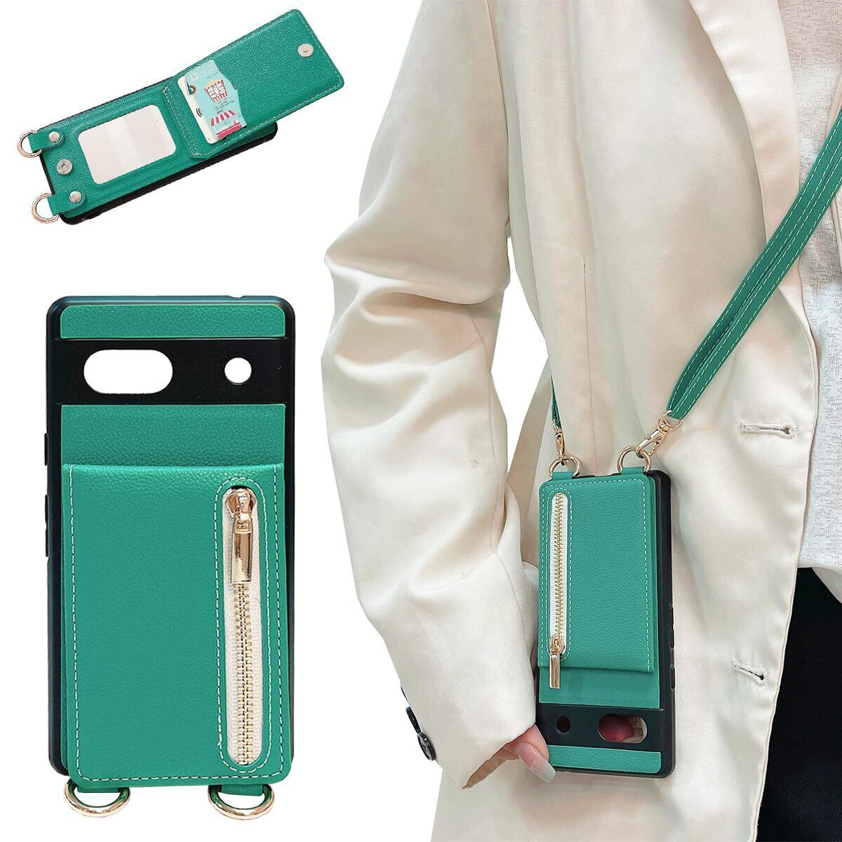 Google Pixel 7A ケース 高質レザー Pixel 7A カバー 肩掛け 首かけ 斜めがけ ショルダー ケース ミラーケース 便利 カードポケット スタンド機能 落ち着いた色 調節可能 軽量 多機能 縦置き ICカード収納 財布型 耐衝撃 携帯 鏡付き ケース グリーン