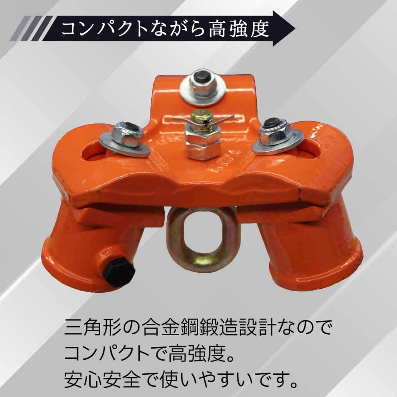 ■使用方法 1 ヘッド中央にレバーホイスト チェーンブロックを掛けてください 2 パイプをヘッドのジョイントに差し込みボルトで閉めてください。 3 2等辺三角形の形となりますので角度のお好みに調節してご使用ください。 ※角度調節後ロープなどでしばっていただくとより安定いたします。 ※三脚ヘッドとベースのみの販売ですので鉄パイプや単管パイプを別途ご用意ください。