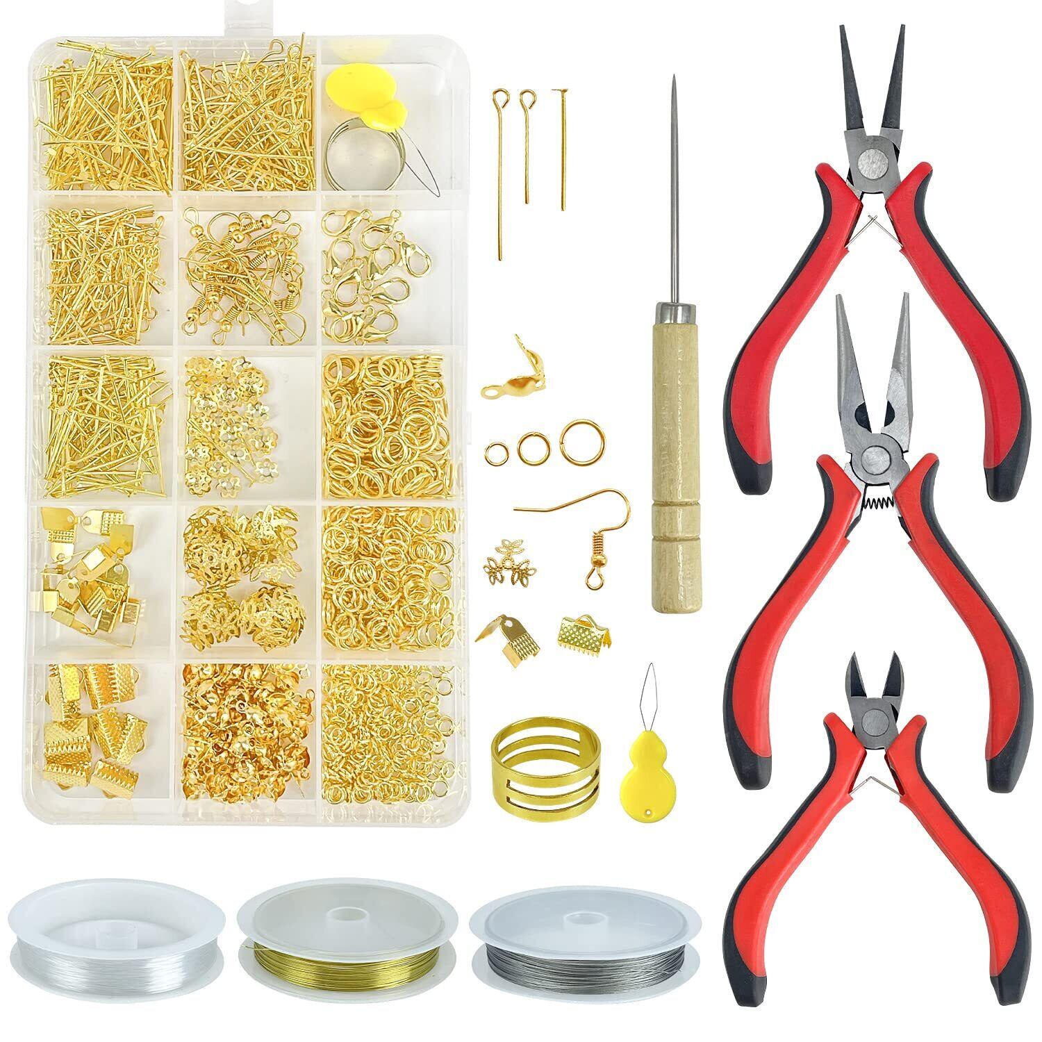 【初心者向け】ペンチセット:丸ペンチ*1、平ペンチ*1、ニッパー*1。 金具セット:15種類、合計1000枚入り。アクセサリーテグス:ゴールド*1、シルバー*1、透明*1。 マルカン(指カン)*1、かぎ針*1それぞれ1010点入りアクセサリーDIYキットです。初心者でも使いやすいパーツセット!