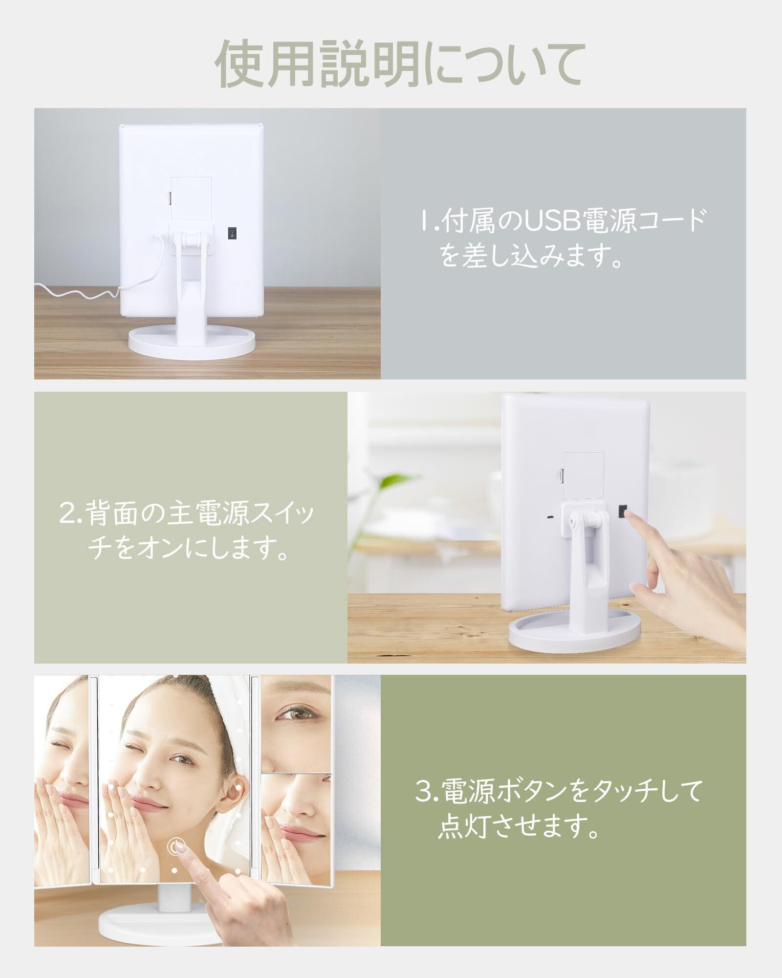 【USB&電池2WAY給電】単4電池4本(付きません)とUSBケーブル(付きます)2 way電源供給で、自宅など固定場所と移動先で電源がない場所も自由に使えます。メイクを楽にお楽しみいただけます。
