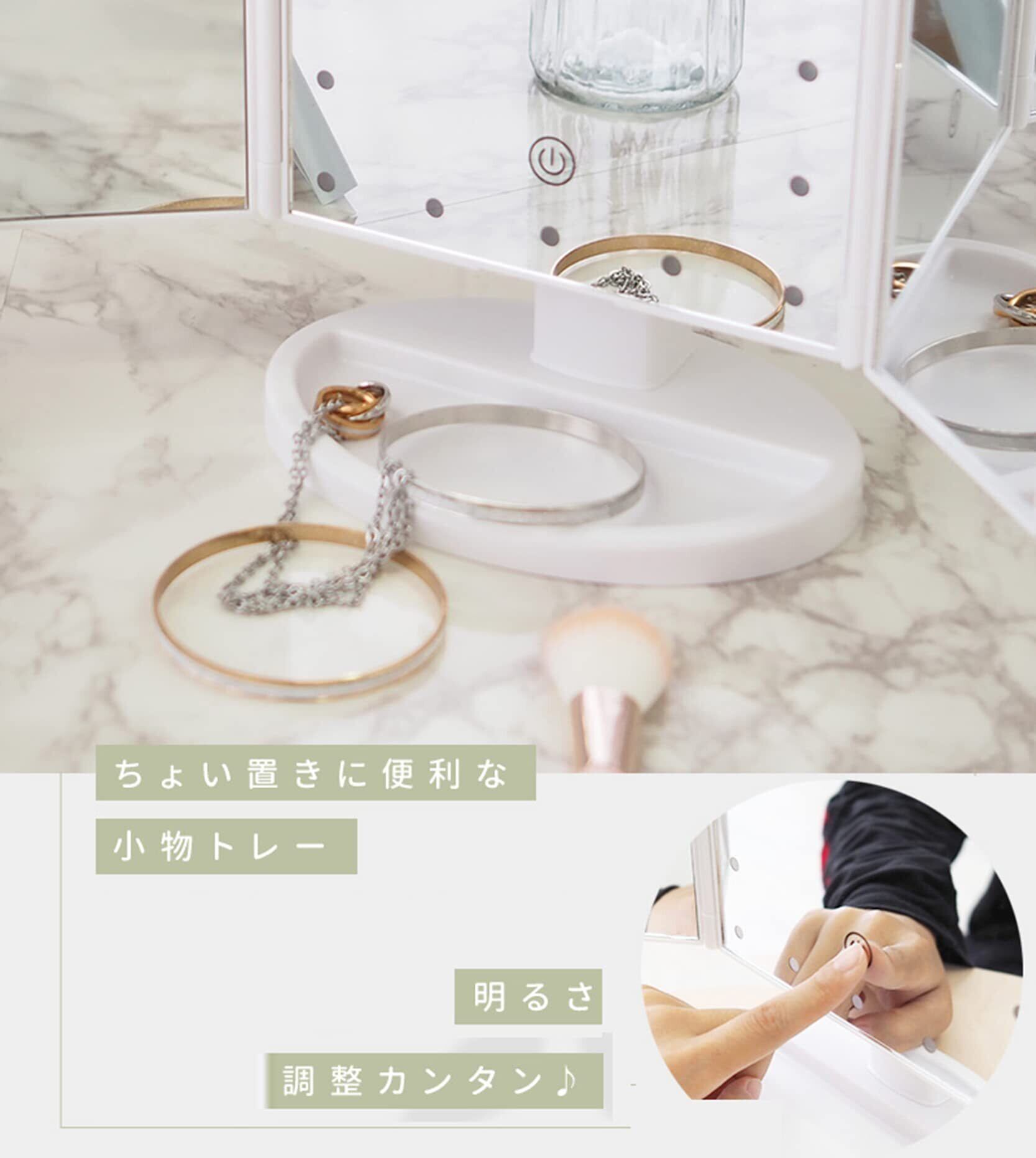 【180°自由回転】三面鏡で左右の確認に加えて、前後180度にも回転するので上下方向からの角度を変えた確認が容易に出来ます。折り畳み式の鏡なので、使わない時はコンパクトに収納できます、ほこりや汚れや破裂を防ぐことができます。また、収納台座が付きなので、ヘアピン、イヤリング、まつげ、口紅など小物の収納には最適です。