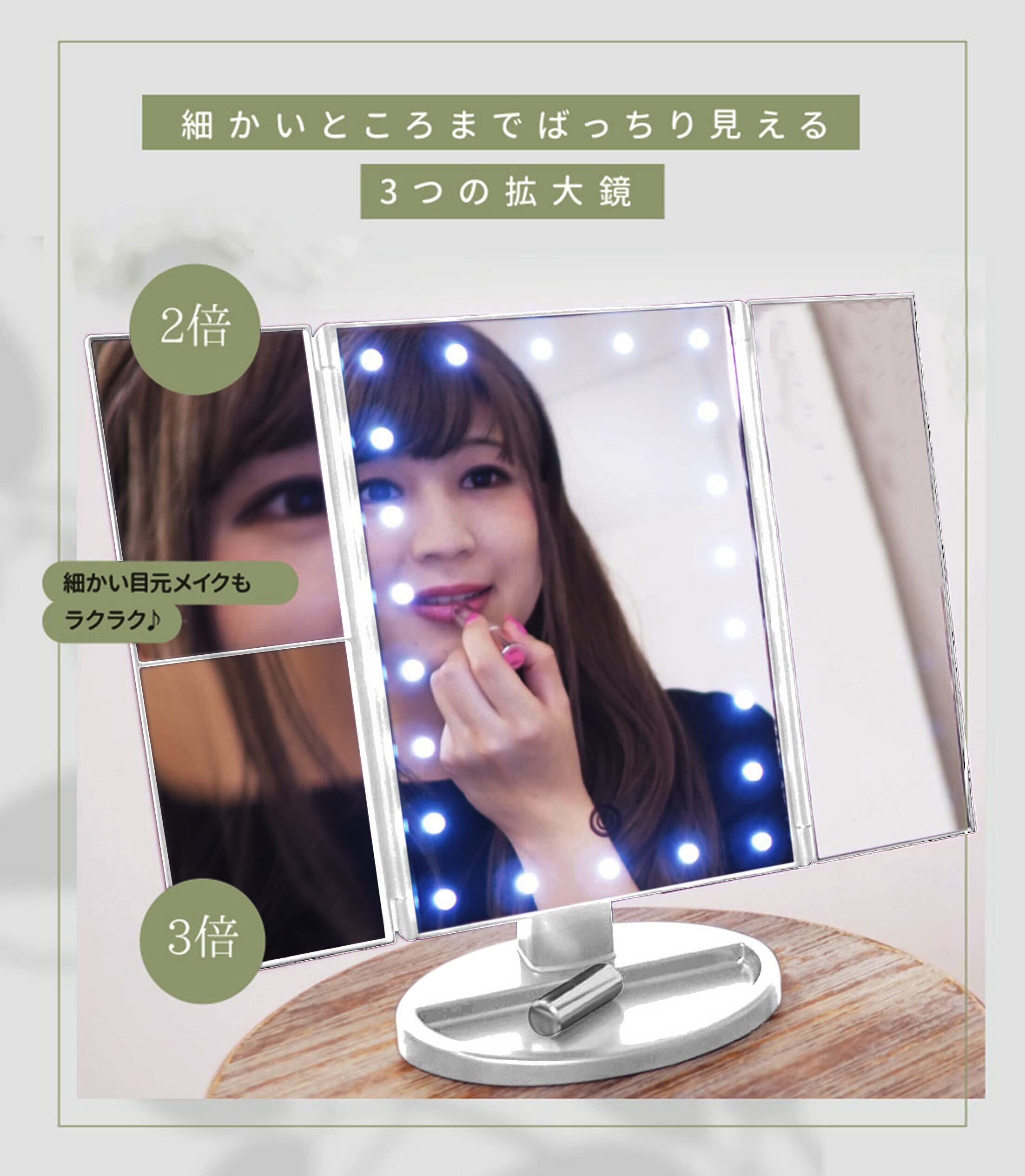 化粧鏡 卓上 化粧ミラー 鏡 21個LED 拡大鏡 2/3倍 明るさ調節可能 180°回転 単4電池&USB 2WAY給電 三面鏡 卓上 女優ミラー