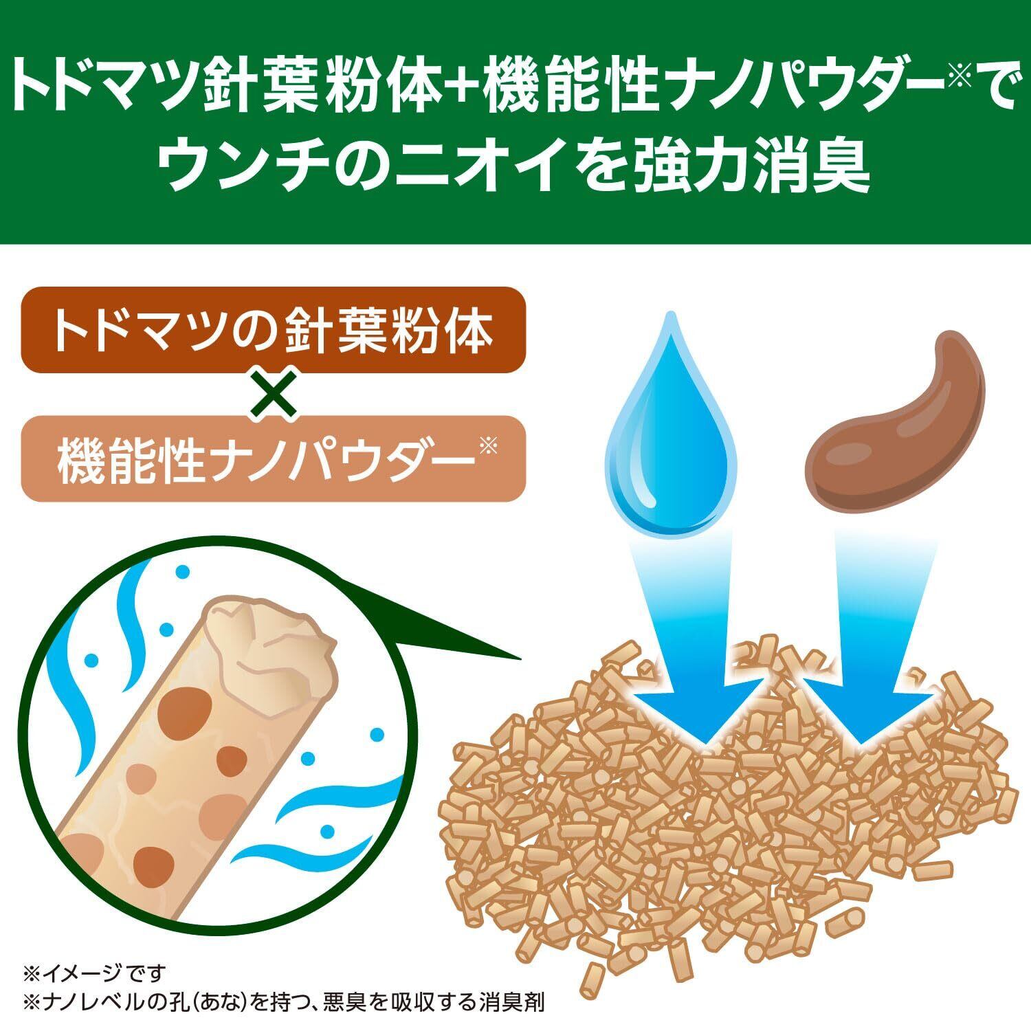 【トドマツ針葉粉体と機能性ナノパウダー※配合でダブル消臭】オシッコだけでなく、ウンチのニオイにも高い消臭効果を発揮します。※ナノレベルの孔(あな)を持つ、悪臭を吸収する消臭剤。