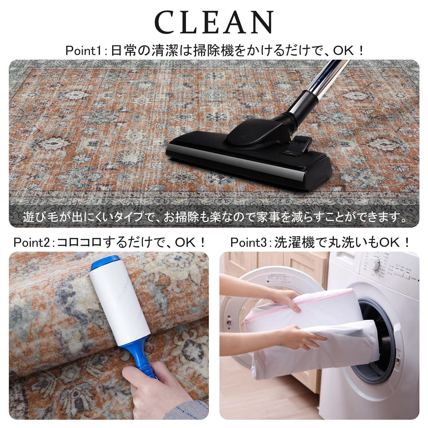 【洗濯機で洗える】密度が高くて短めの毛足はゴミが絡みにくく、日常の清潔は掃除機をかけるだけで、OK!汚れた場合は手洗いや洗濯ネットに入れて洗濯機で洗うことができます。※ラグは風通しの良いところで陰干しして、アイロン、乾燥機はご使用をお避け下さい。