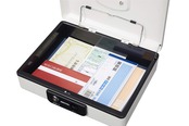 【B5の家計簿や出納帳が丸々入るワイドなサイズ】・外寸:幅約30×奥行約23.8×高さ約8.9cm・内寸:幅約27.8×奥行約20.5×高さ約6cm・質量:約 2.24kg・スリムタイプでレジカウンター下などに収納しやすいサイズです。・イベントでの現金管事務所のレジ兼金庫、家計簿や封筒、通帳、印鑑、パスポートなどご家庭の貴重品保管に便利です。