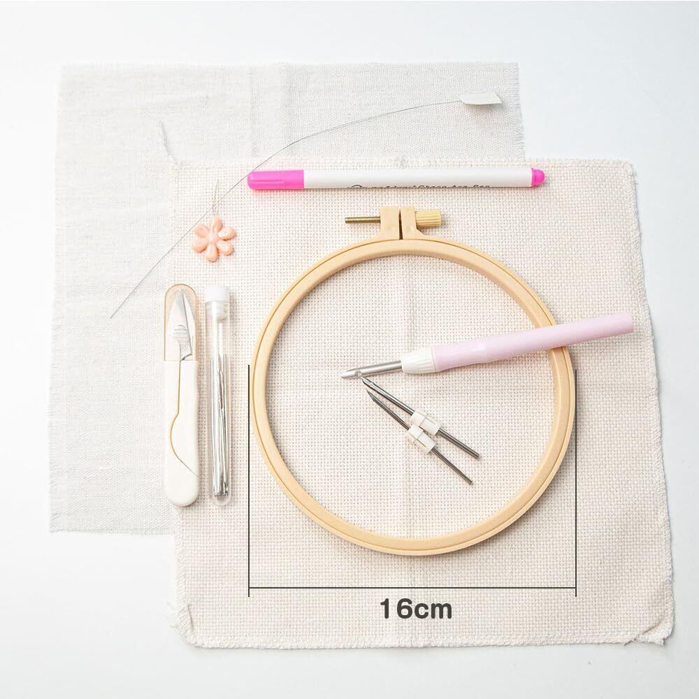 【セット内容】刺繍フープ、糸パンチ針、糸刺繍ペン、パンチニードルクロス、ファブリックマーカーペン、9つの大きな目の針、糸ハサミ、糸通し器2本、長いワイヤー糸など、必要な道具が全て揃っています。