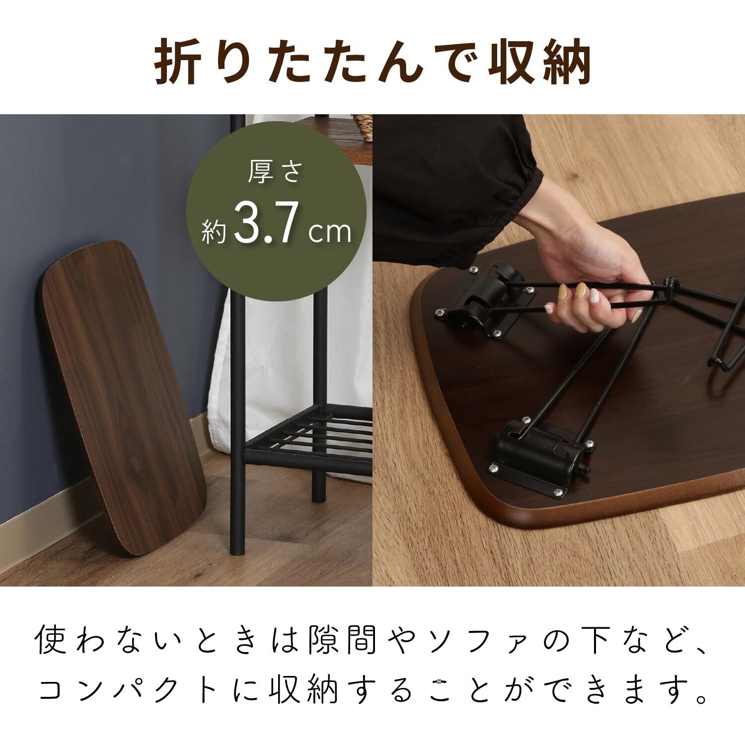 このテーブルは折りたたみ可能です。使用する際は、指や手を挟まないように注意してください。また、テーブルの安定性と重量制限を考慮してください。