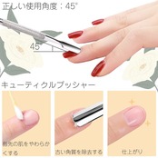 45°の正しい角度で使用する。角度のついた先端は、残ったマニキュアを削り取ったり、爪の継ぎ目をきれいにしたりするのに使えます。滑り止め付きハンドル、ジェルネイルの甘皮を取り除くのに便利なキューティクルプッシャー。