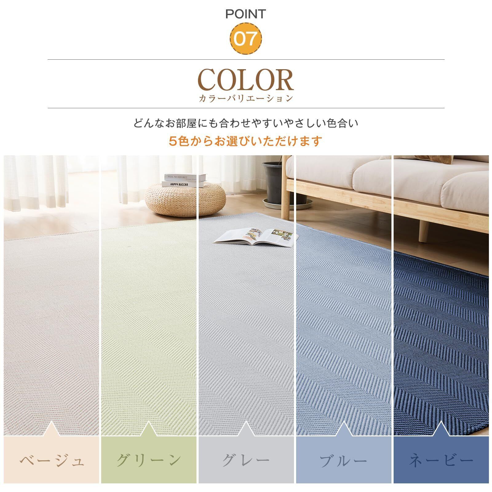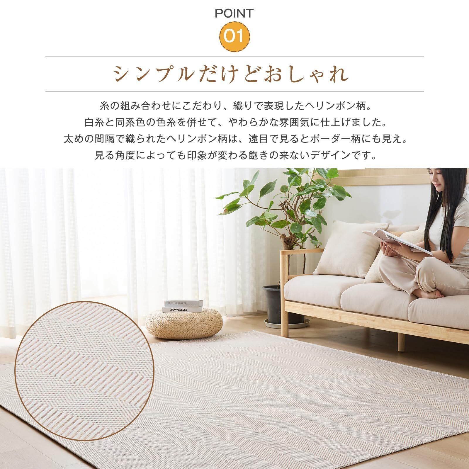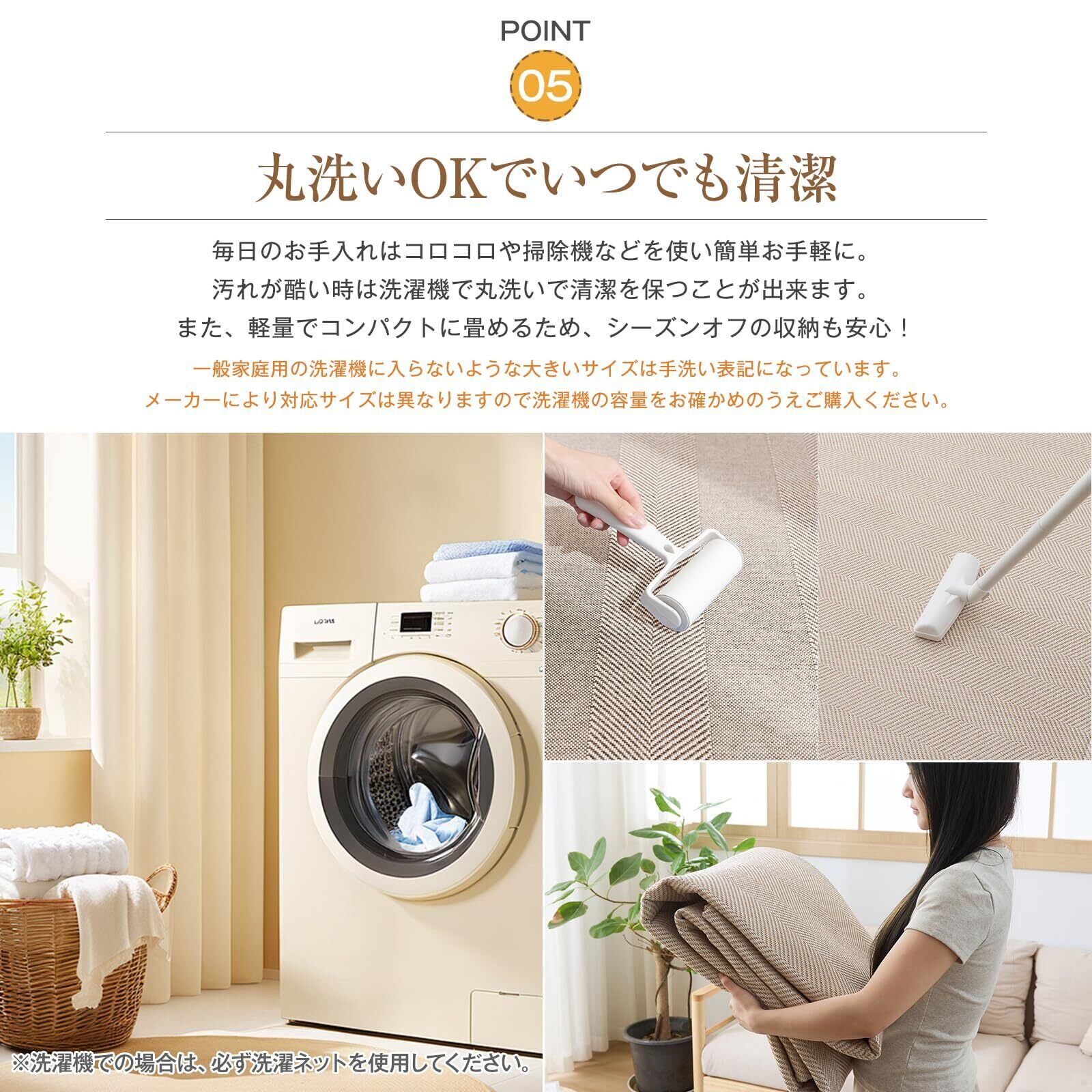 【お手入れ簡単】毛足がないので、ゴミなどの絡まりにくく、コロコロや掃除機や粘着クリーナーもササっとかけやすいです。部分的に汚れた時は、中性洗剤を薄く溶かした水をタオルなどに含ませ、固く絞って拭き取ってもいいです。さらに、ヘリンボーン材質の特性上、耐久性に優れ、長くお使いいただけます。※洗濯機での場合は、必ず洗濯ネットを使用してください。