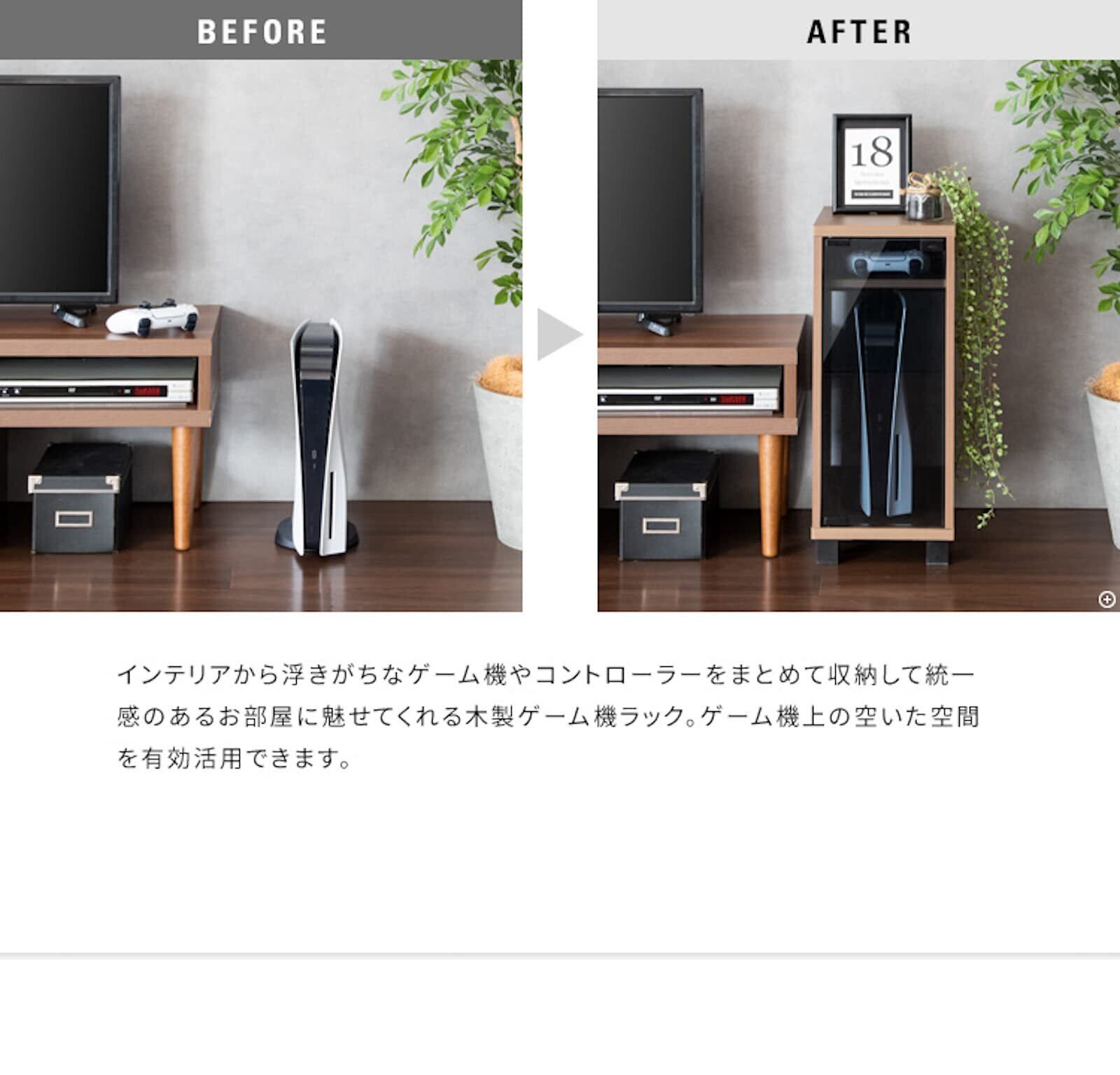 PS5等、縦置き型ゲーム機がスッキリ収納できるラック 邪魔にならない省スペース設計でお部屋に馴染む木目柄のスマートなデザイン