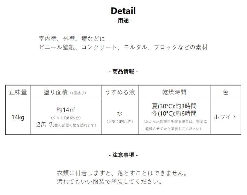 塗り面積(1回塗り)約14平方メートル(タタミ約8.5枚分)。
