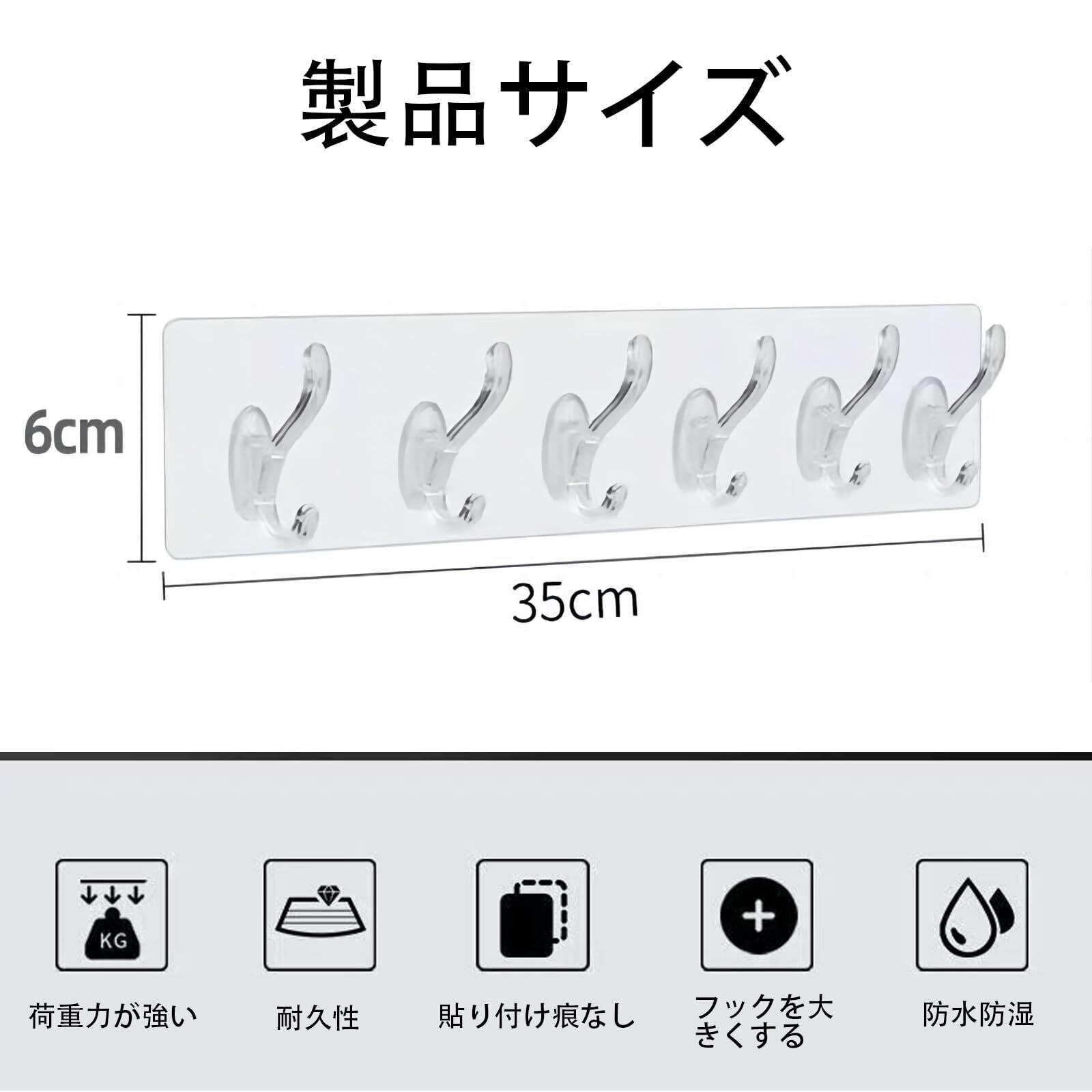 ウォールハンガー 防錆デザイン パンチフリー 壁掛けフック 強力貼付痕なし 耐荷重強化 収納便利 ドアの後ろのクロークフック キッチン・玄関・浴室用 コート・帽子・タオル掛け 耐水性6連収納ハンガー (6連列フック, 35*6cm)