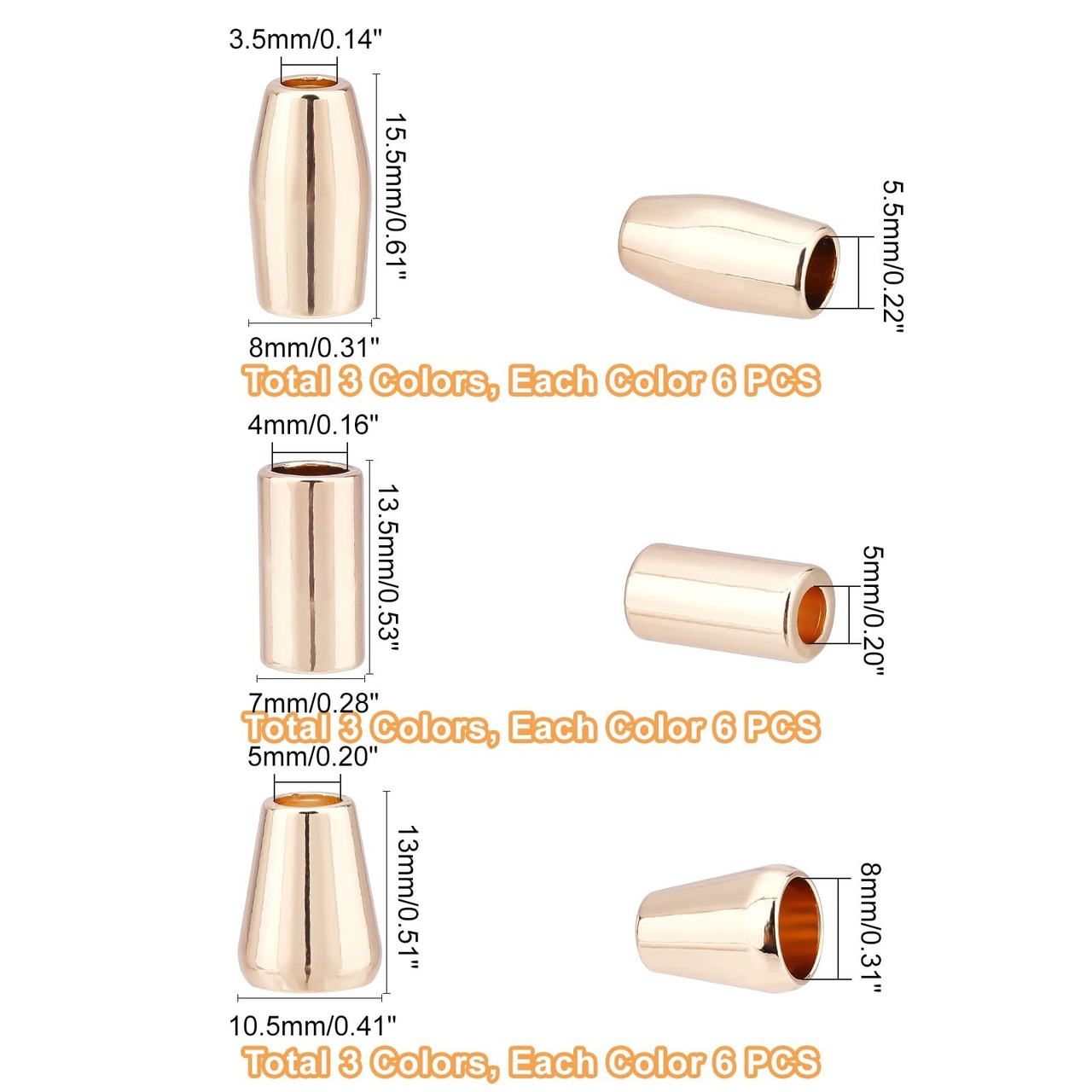 寸法:バレル:15.5x8mm、穴:3.5mm、内径:5.5mm。锥体:13x10.5mm,孔:5mm,内径:8mm。円筒形:13.5×7mm、穴:4mm、内径:5mm