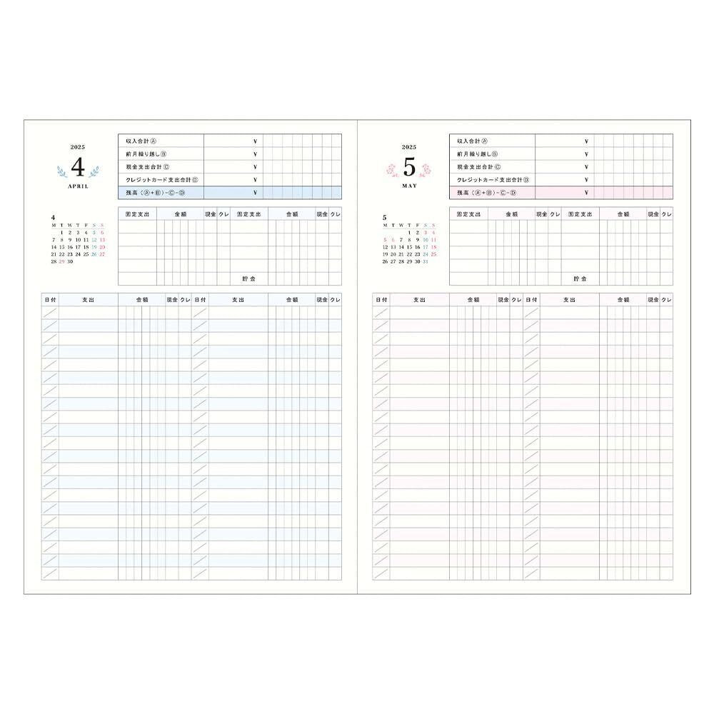 箔押しのダイヤモチーフがキラリとした輝きを放つシンプルな人気デザインの手帳。 淡いパステルカラーの色合いが日常生活を華やかに彩ります。2025年版からは新色として、さわやかなブルーとやさしいパープルがラインアップ。 上質感のあるレザー調のカバーには名刺や付箋などが挟めるカードスリットと、ペンをさっと取り出せる便利なペンホルダー付き。 可愛らしさもありながら、シンプルで使いやすいフォーマットの家計簿付きのオールカラー手帳。 プライベートもビジネスも両立させたい、独り暮らしの学生や社会人にもおすすめのアイテムです。
