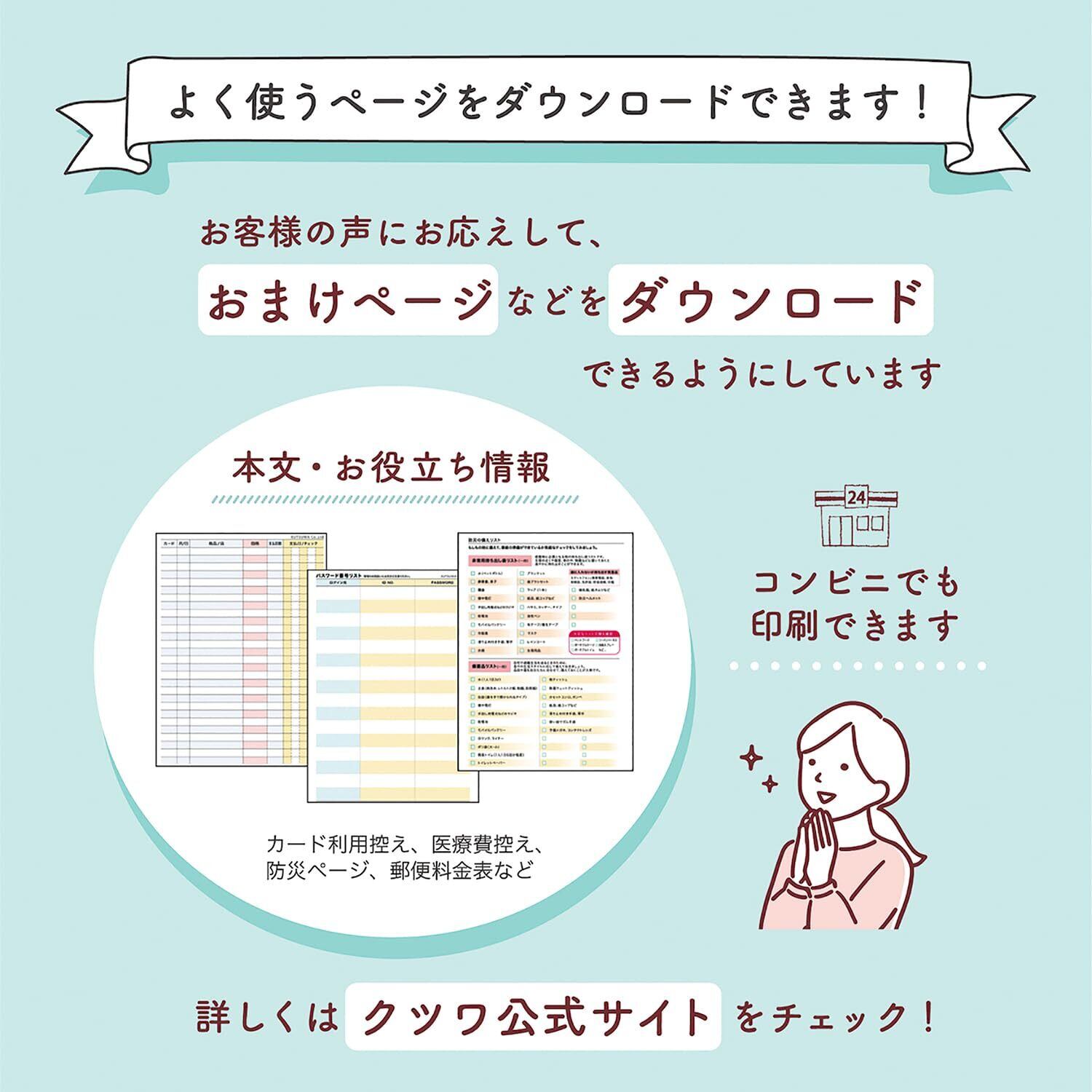 【コンテンツ】年間カレンダー、年間計画表、家計簿メモ、年間収支表、年齢早見表/贈答品リスト/お誕生日メモ、パスワード番号リスト/記念日メモ、災害時の連絡ガイド/緊急時の連絡先メモ、防災の備えリスト/ 家族の連絡先メモ、テレフォンガイド