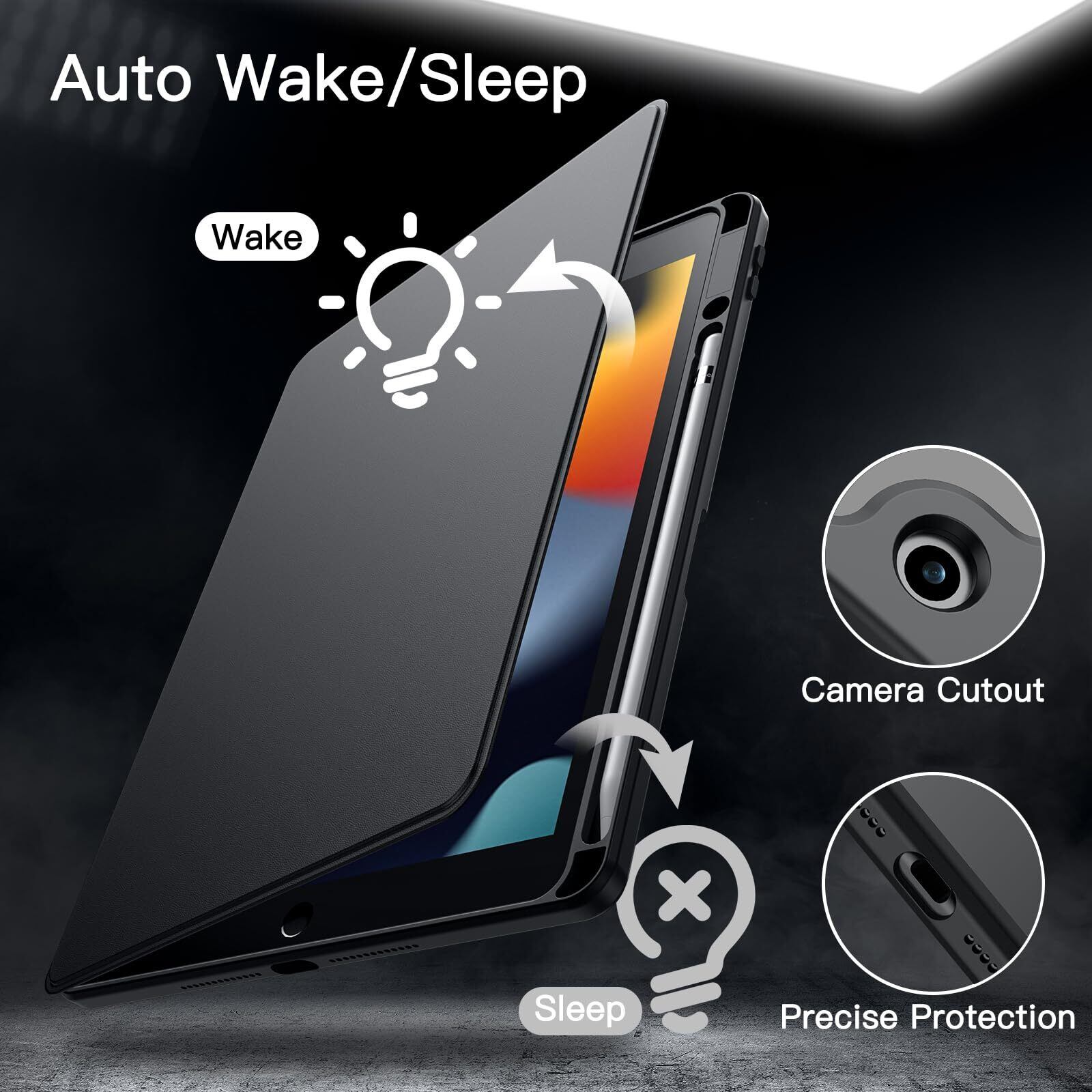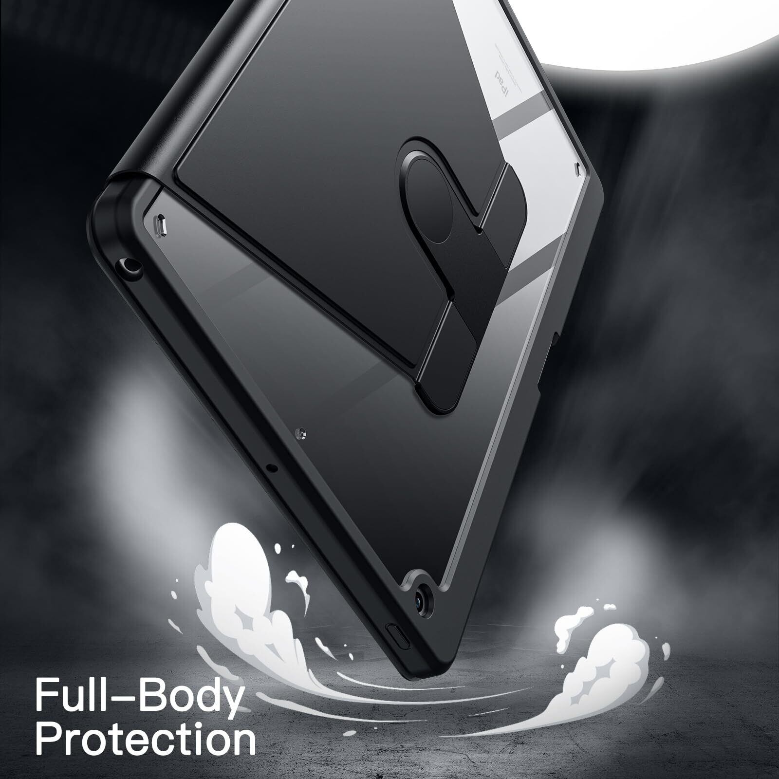 JEDirect 回転ケース iPad 9/8/7 (10.2インチ、2021/2020/2019モデル、第9/8/7世代用) Pencilホルダー付き 360°保護 スタンドカバー クリアバック 自動ウェイク/スリープ (ブラック)