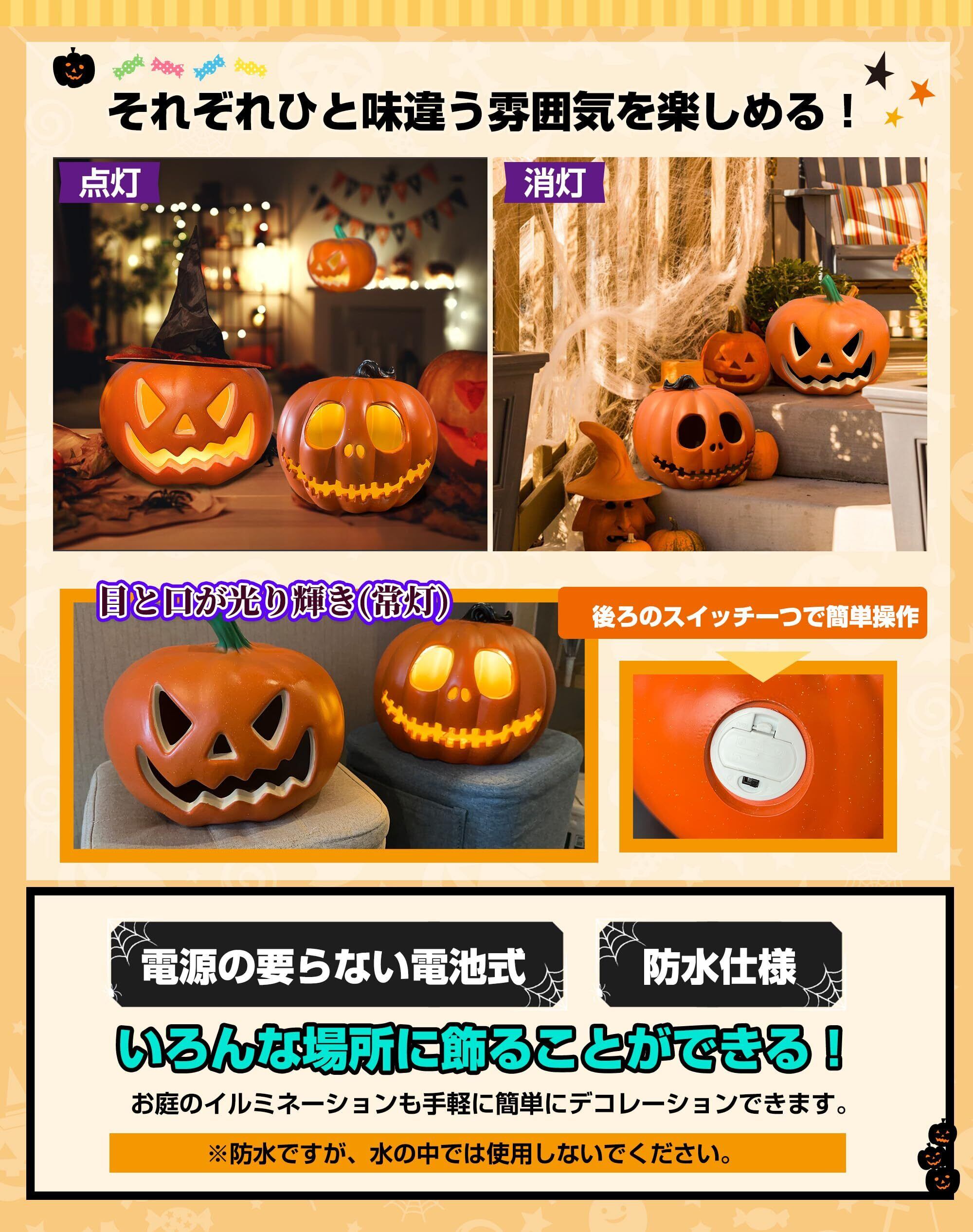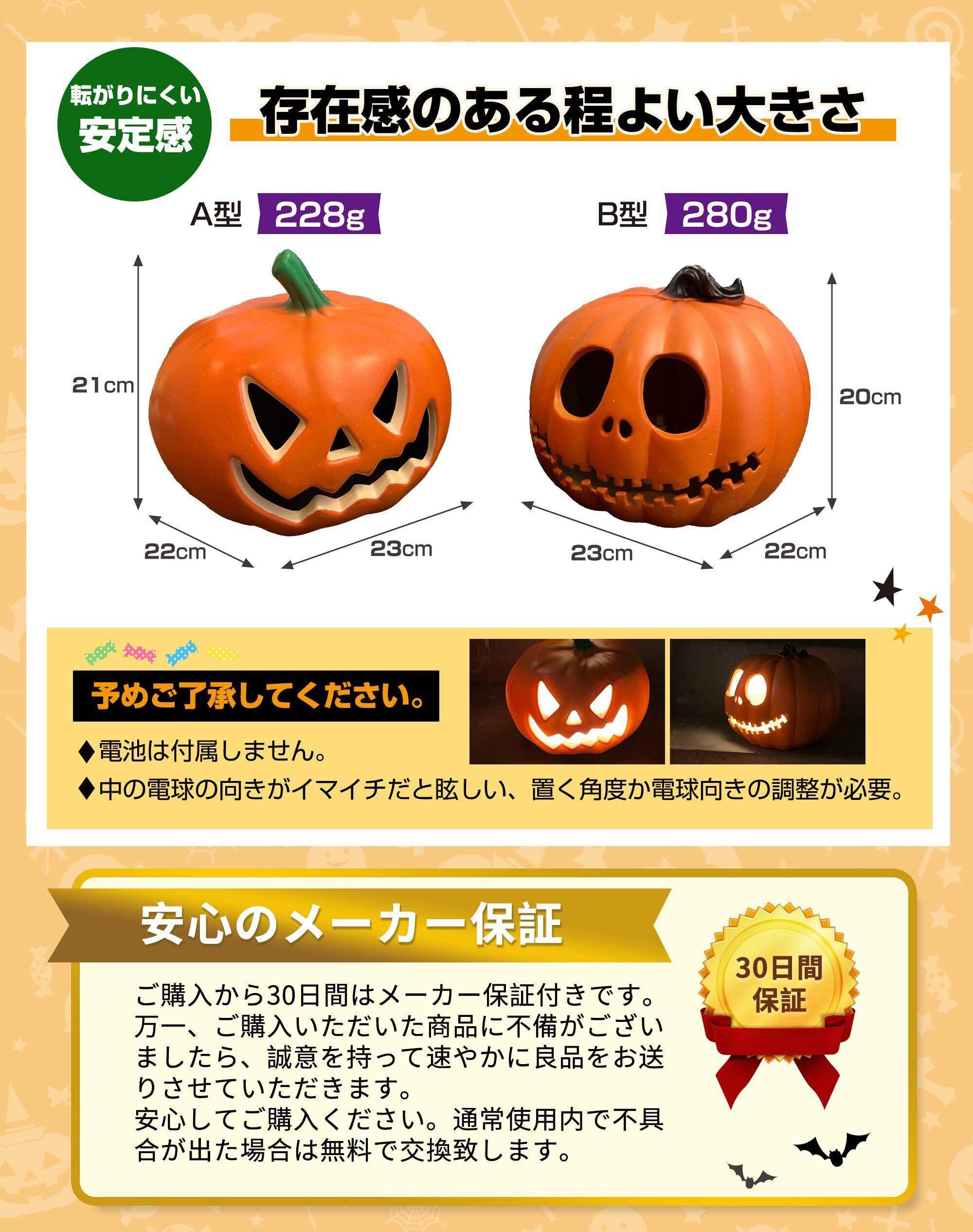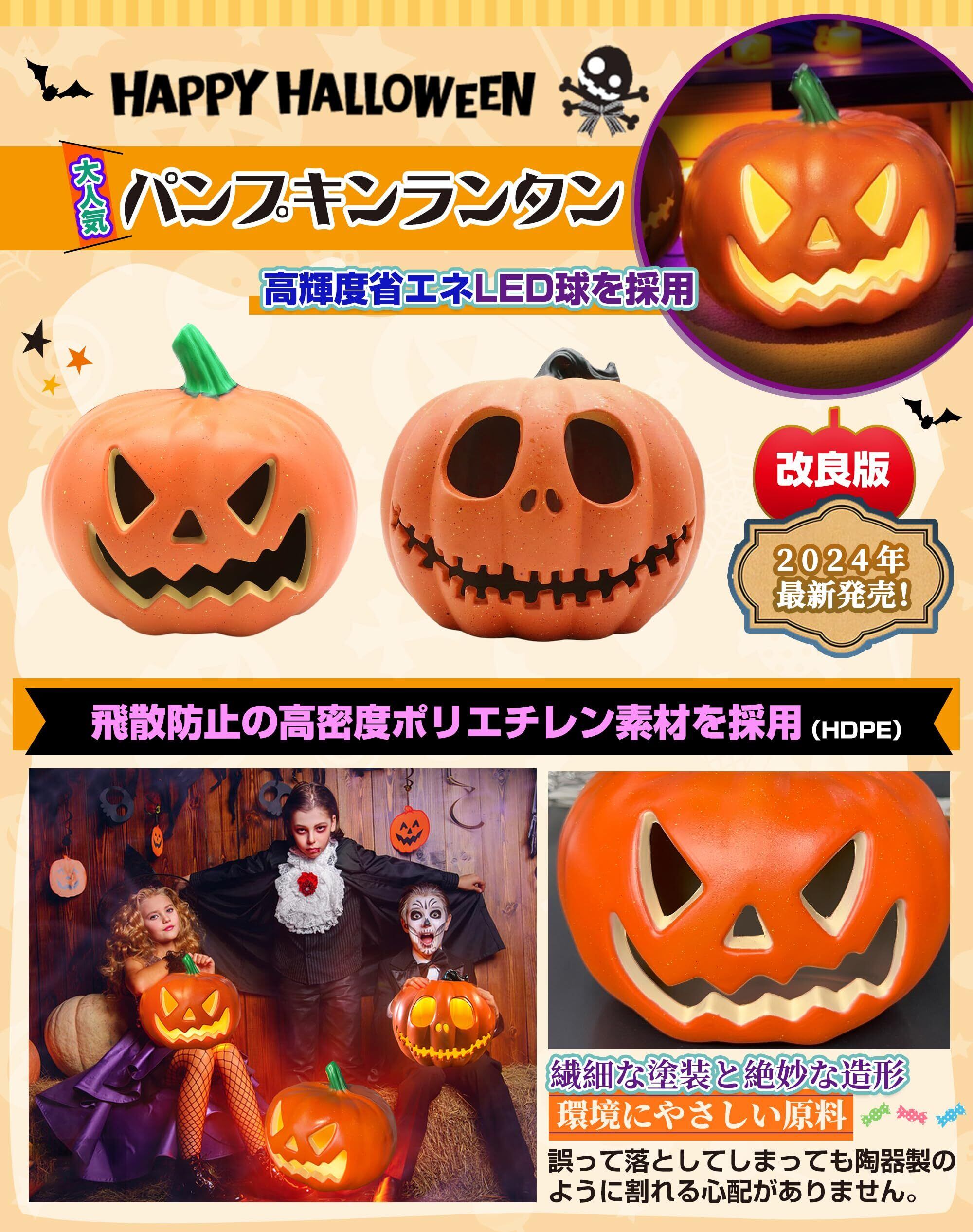 【大人気のパンプキンランタン】2023年最新発売!「電池の蓋が閉まらない」の購入者からのフィードバックを頂き、製品の「電池蓋」部分の改良を行いました。従来品のLED発光部1個から4個にパワーアップ!後ろのスイッチを入れると、中のLEDが光り、目と口が光り輝きます(常灯)。点灯時/消灯時それぞれひと味違う雰囲気を楽しむことができます。※中の電球の向きがイマイチだと眩しい、置く角度か電球向きの調整が必要。顔のデザインは2種類の怪しげな表情があります。パンプキンの大きさ23cm×22cm×21cmと大きいですので存在感があります。 ギフト:1枚のハロウィン専用蓄光タトゥーシールをワンセットでお届け致します。※ハロウィン蛍光タトゥーシールの色はランダムに配っていますが、ご理解ありがとうございます。