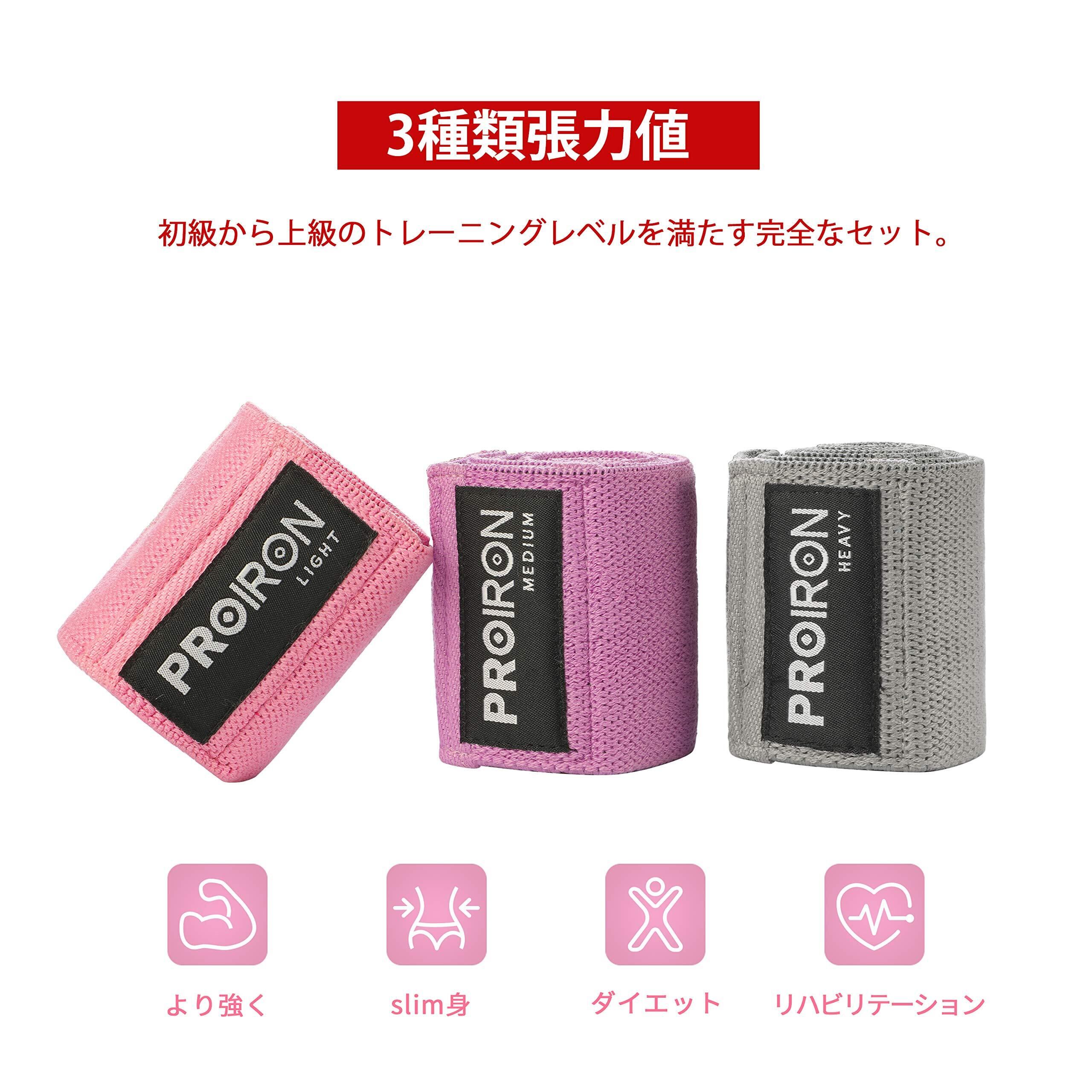 PROIRON ヒップバンド 美尻バンドトレーニング 特製ゴムバンド付き 強度別3本セット フィットネスバンド エクササイズバンド ヒップ 太もも ダイエット 強い耐久性 収納袋付き 両面ライナー布ノンスリップ 美尻 美脚 桃尻改造 筋トレ