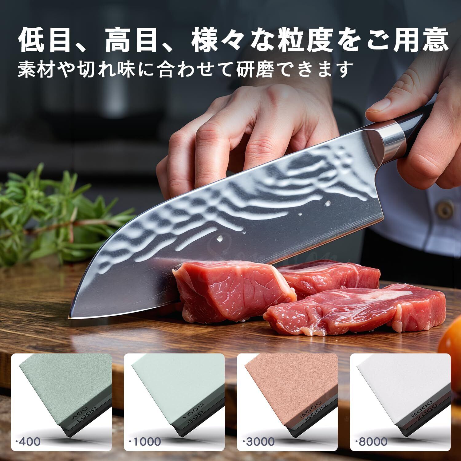 【荒砥石中砥石一括】400と1000の荒砥石は、切れ味の悪い包丁や損傷した刃を一番鋭く研げる。3000と8000の仕上砥石は、より良い切れ味を追求したい時に役たちます、包丁をピカピカするには楽々