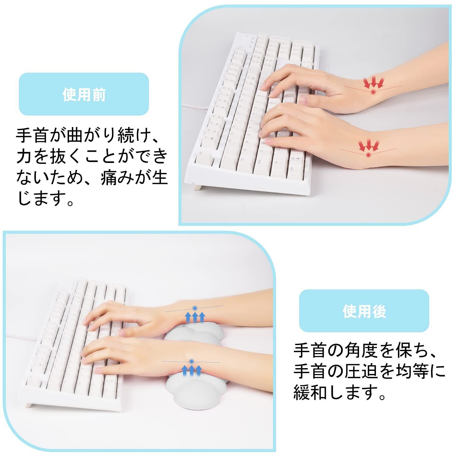 【人間工学と雲の形状デザイン】特殊な雲の形状デザインがあなたの手首にぴったりとフィットし、手首が正しく整列され、肘や肩の圧力を軽減します。凹凸面デザインで手首が快適で乾燥した状態を保ちます。このかわいく、おしゃれで人間工学に基づいたキーボード用手首サポートは、仕事や勉強に最適なパートナーです。