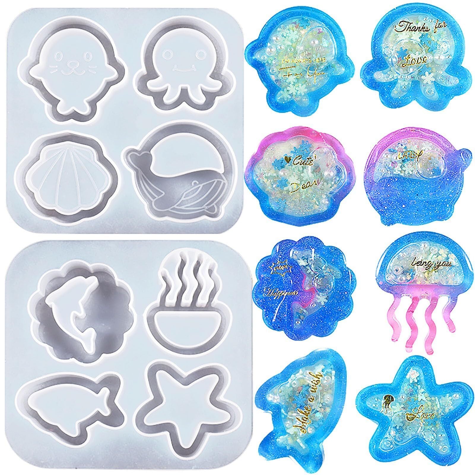 【セット内容】かわいいシェイカー型のセットです。 クラゲ、貝殻、ヒトデ、イルカ、タコなど8種類のシリコンモールド2個。 (完成品は付属しません、シリコンモールドのみです)