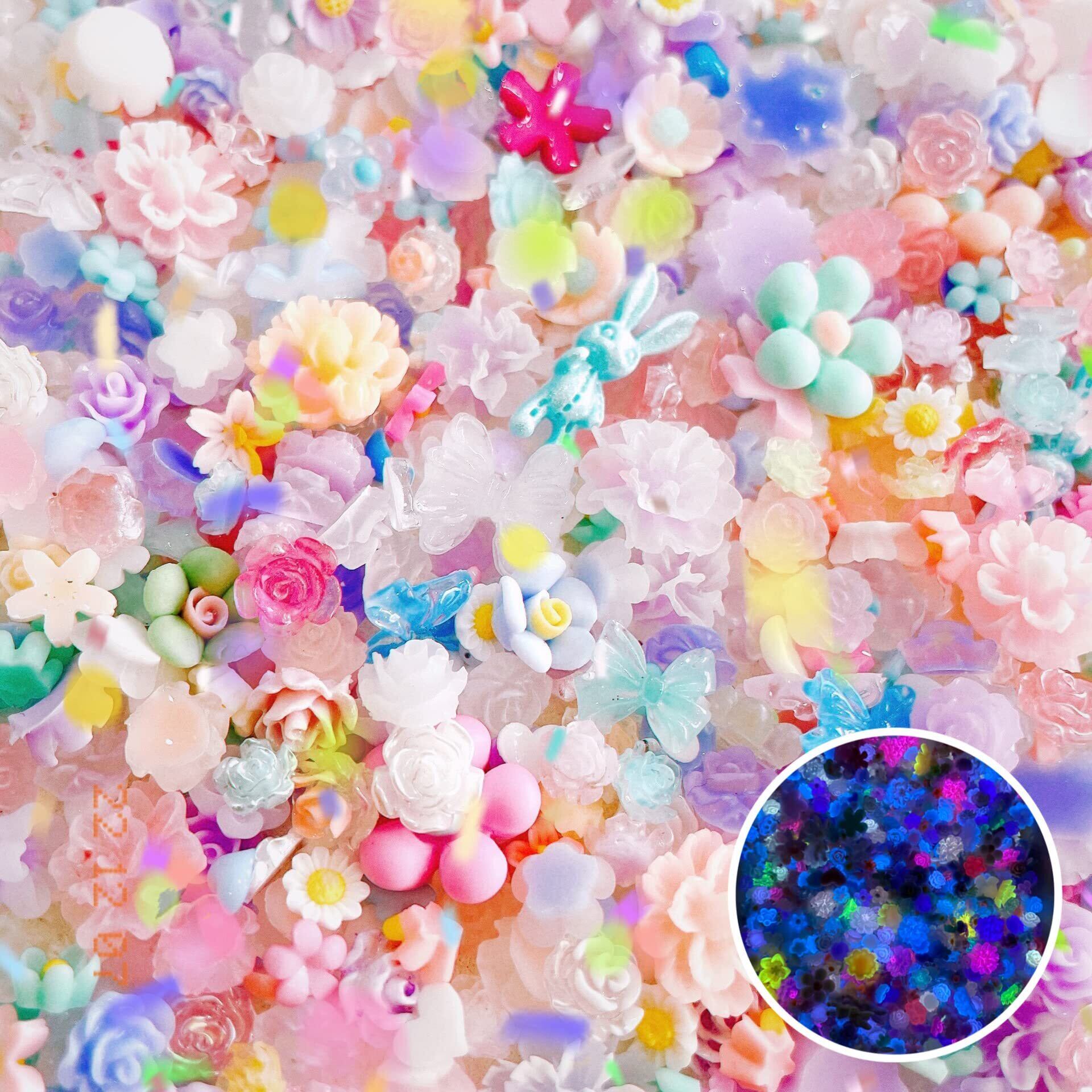 夜光 ネイルパーツ 花 星 蝶々 種類豊富 100pcs リボン ネイルデコレーション 3D 立体 アクセサリーパーツ レジン用 DIY ジュエリーパーツ (夜光彩色系)