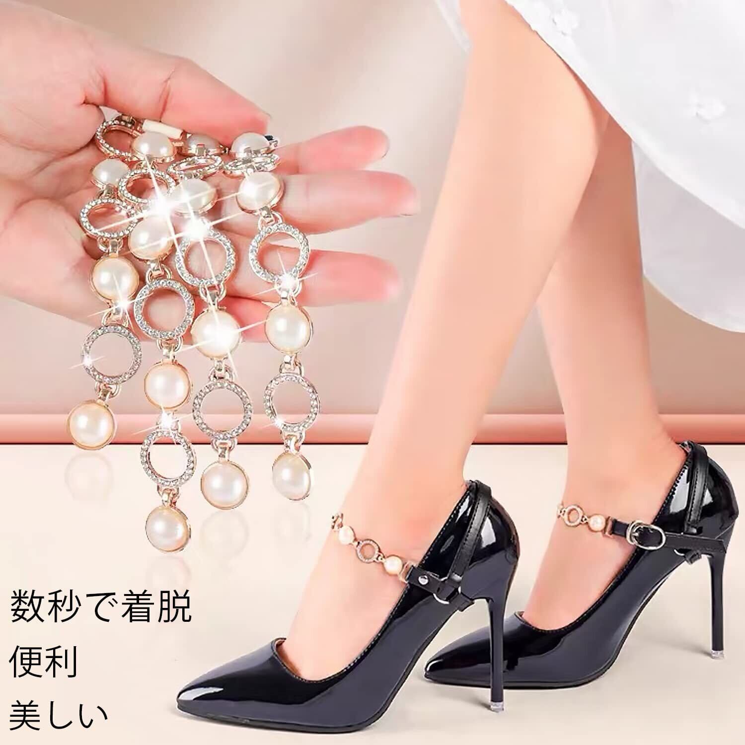 【素材】上質な透明シリコンを使用し、繊細なダイヤモンドインレイとパールチェーンでヒールの美しさとエレガントさを演出します。