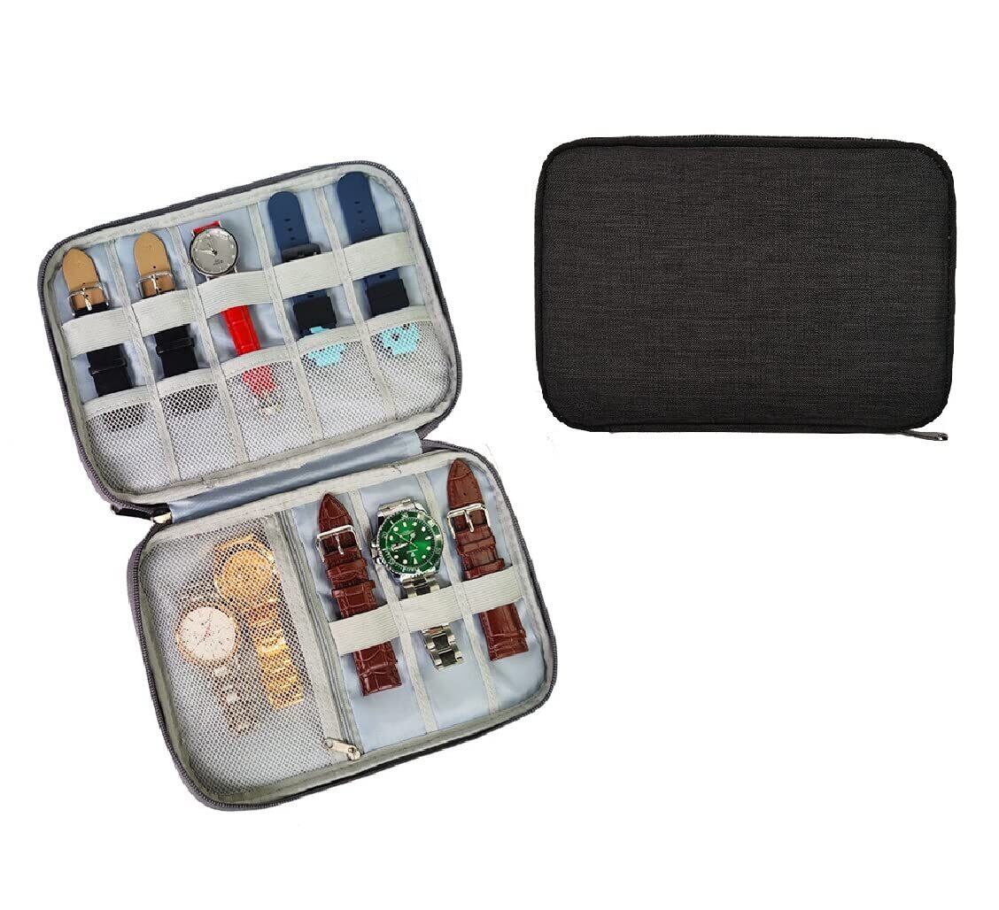 左側に伸縮ゴムが5つあり、右側に伸縮ゴムが3つあって、ファスナー付きメッシュポケットもあります。腕時計、時計ベルト、その他の時計バンドのアクセサリーを収納するのに最適です。