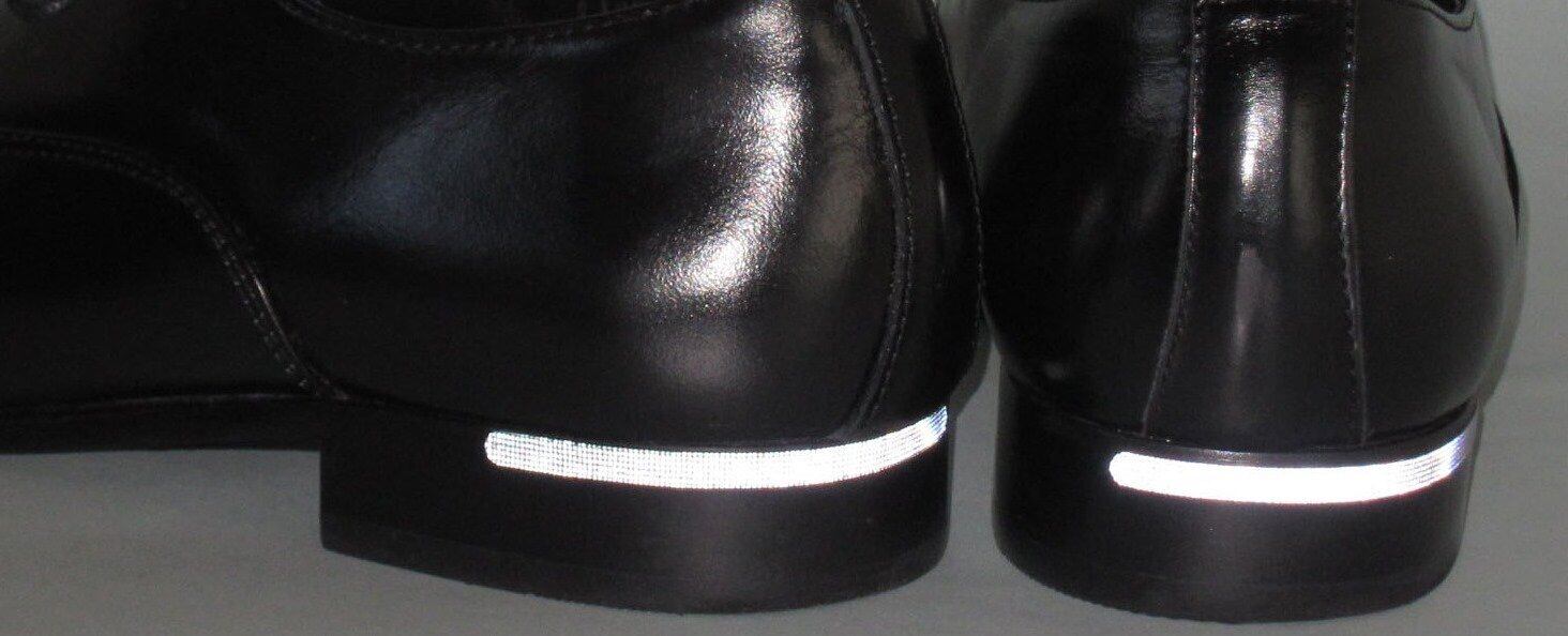 11.5cmのロングタイプ反射材を靴のカカトから横方向に貼ると後方・側面のライトを反射し、光って居場所を知らせる