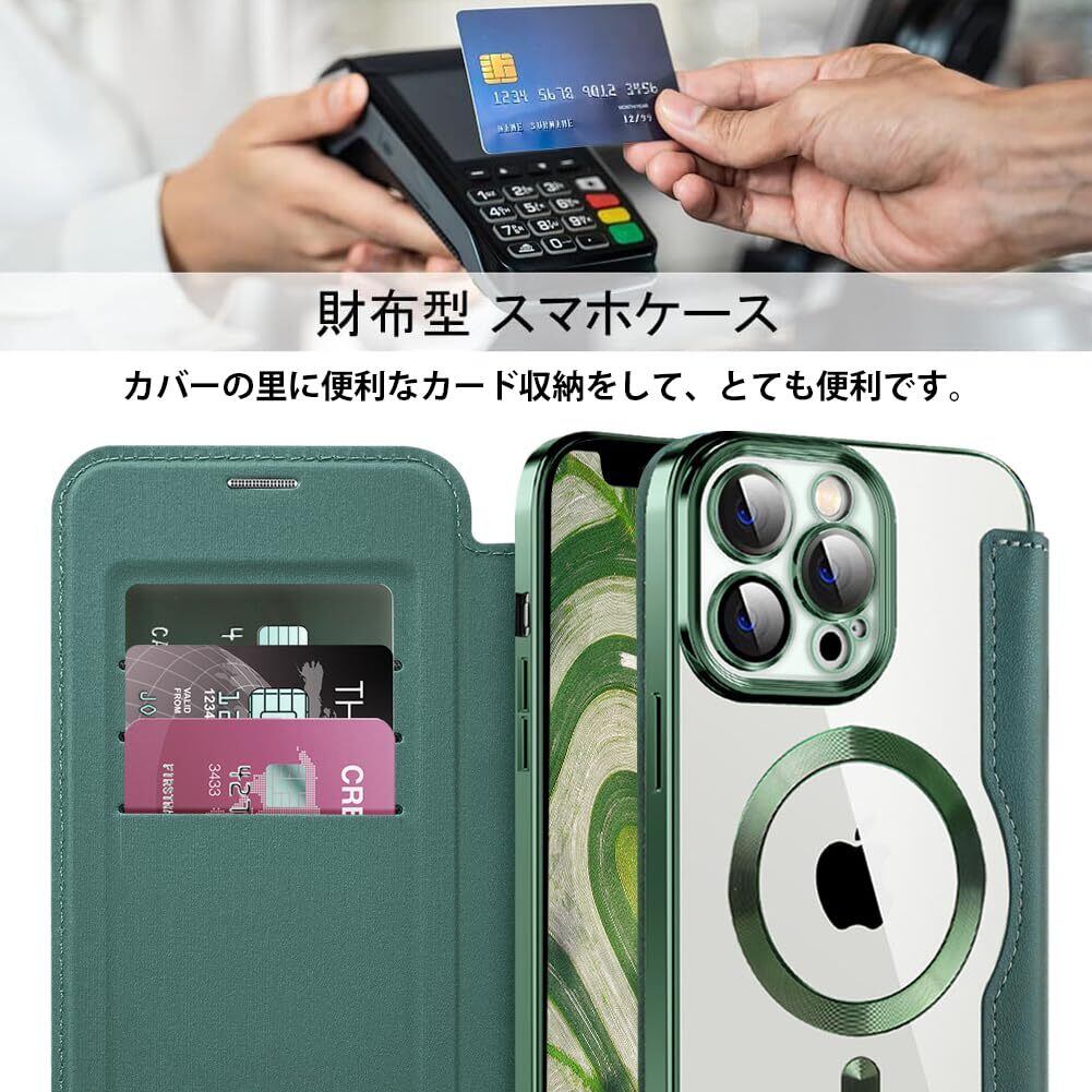 iPhone 15 Pro ケース ハイブリッド ワイヤレス充電対応 米軍MIL 規格取得 耐衝撃性 黄ばみなし 指紋防止 簡約 シンプルスタイル 手帳型 カード収納 超薄型 ケース レンズ保護 カバー対応 手帳型 全面保護 アイフォン15pro 6.1 インチ グリーン