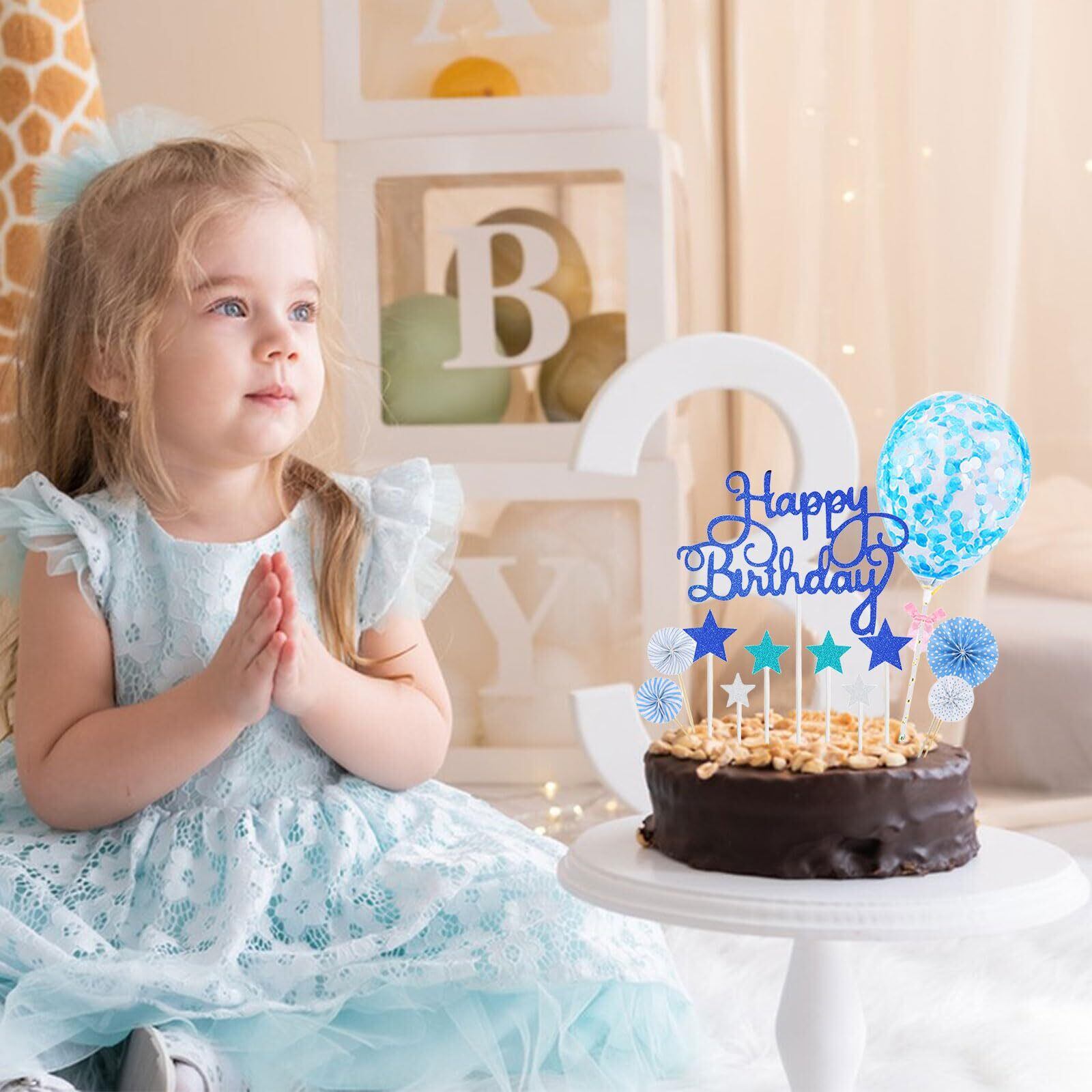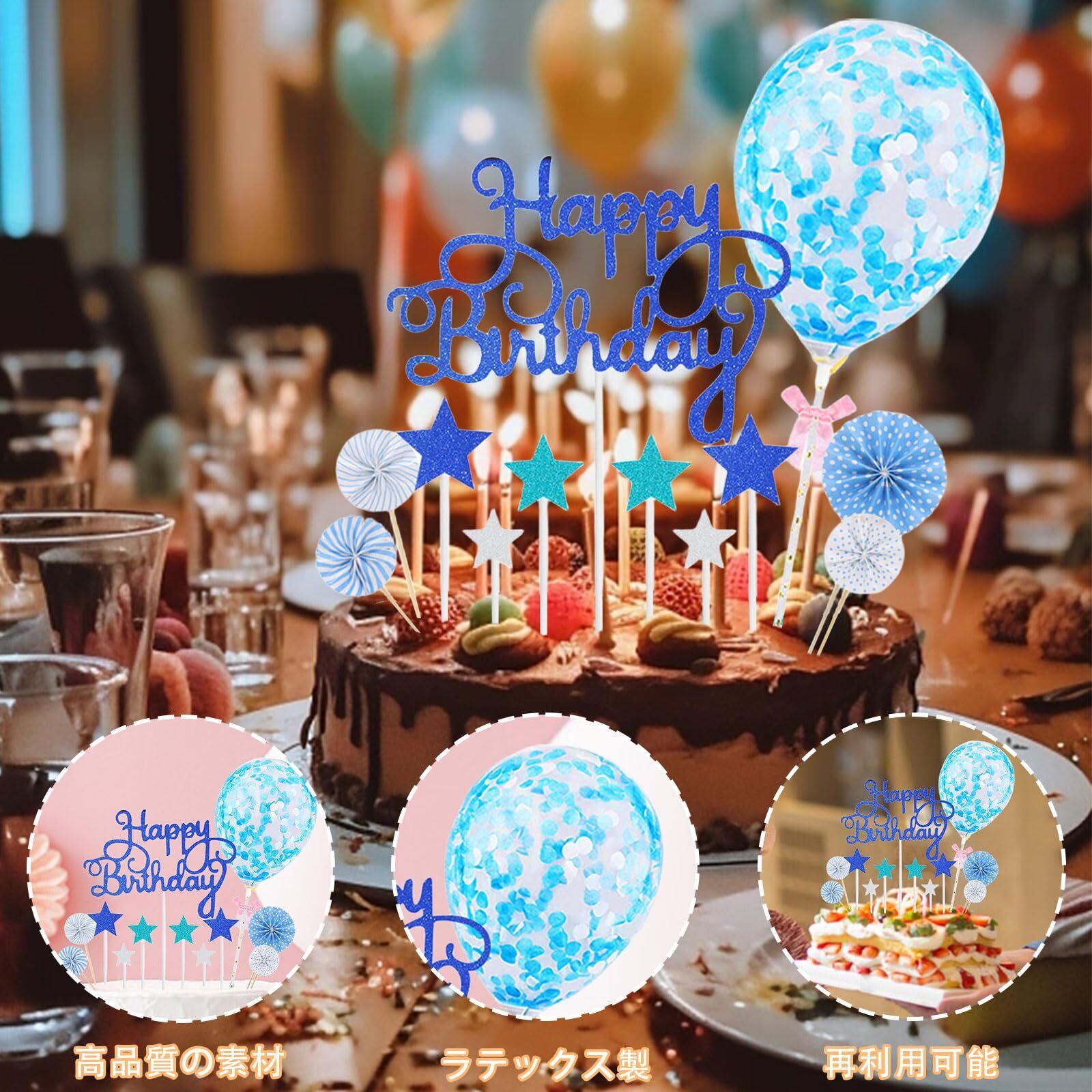 ケーキトッパー 誕生日 12点セット Happy Birthday ケーキ挿入カード かわいい 風船 ペーパーファン 星 ケーキトッパー 誕生日ケーキ飾り 豪華セット ケーキデコレーション (blue)