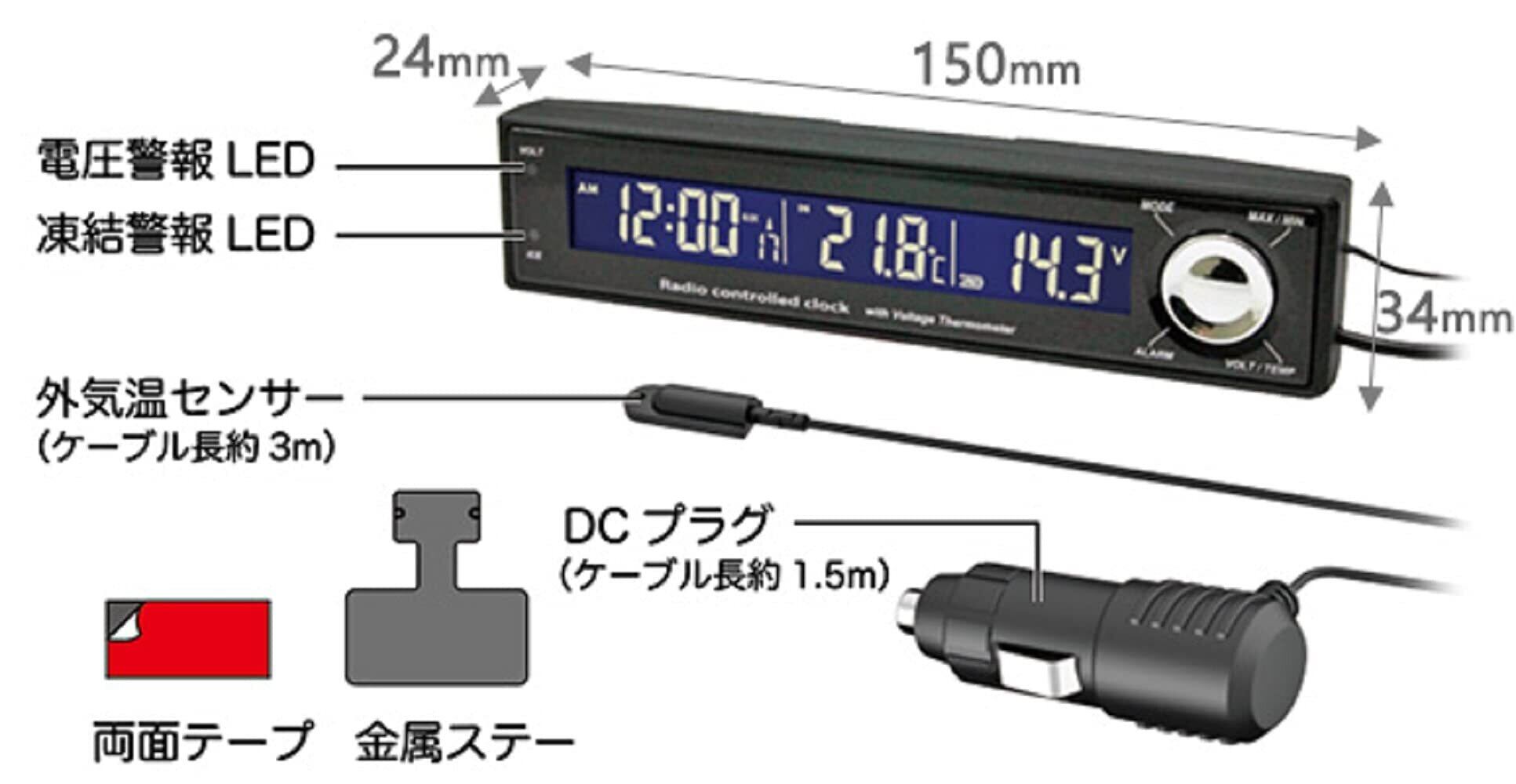 ●車外気温センサーは本体から独立した配線式(コード長3m)、車内気温センサーは製品本体に内蔵。
