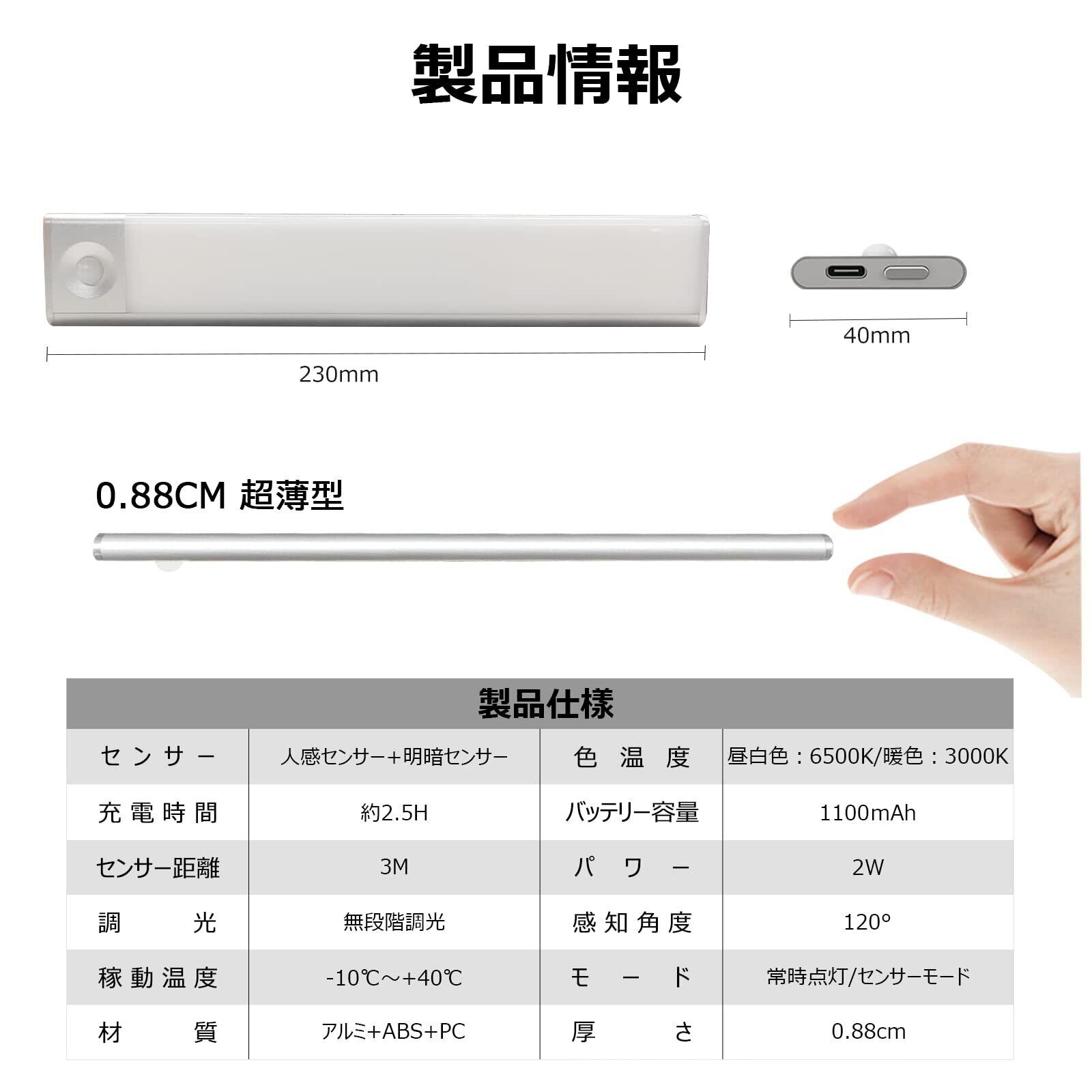 【大容量電池&USB充電】大容量の電池を搭載しており、USBケーブルで充電でき、電池交換の面倒もない。1回のフル充電で約6-28時間の連続点灯が可能です。ご注意:明るさと点灯モードにより使用時間が違います。【省エネ・小型】23*4*0.88cmの小型のライト本体はとても軽量で、狭い隙間にも使える省スペース設計です。思ったより小さい声もありますので、注文する前にサイズをご確認ください。