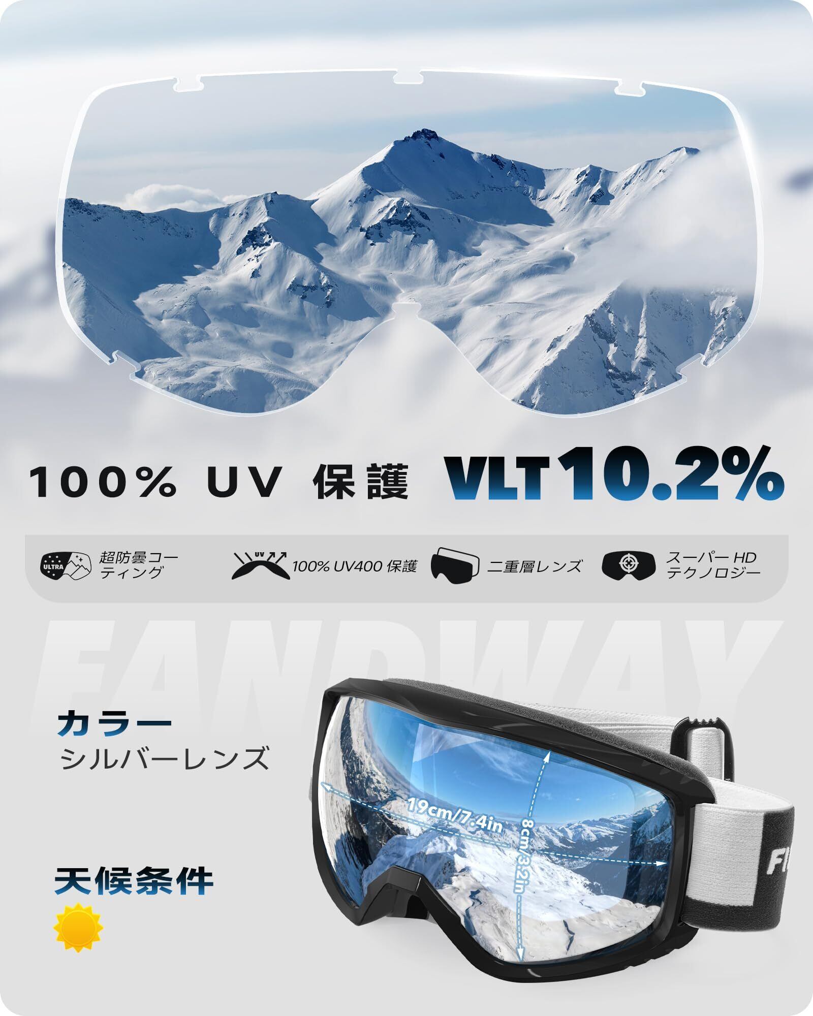 【新しくアップグレードされたデザイン】Findwayの新しくデザインされた広角球面デュアルレンズスキーゴーグルは、スタイリッシュな外観と最新のカラーマッチングを備えています.ミラーコーティングのおかげで、雪山のグレアを抑えるだけでなく、インナーレンズまた、地面をはっきりと反射します.ブルーライトを凹凸でブロックし、反射で有害な紫外線をブロックし、UV400をブロックし、目を保護しながら光学的透明度を提供します.より安全にスキーを楽しみましょう。また、どんな照明条件でも歪みなく地形を見ることができます。スキーやスノーボード中に周囲をよりはっきりと見ることができ、視覚障害による衝突のリスクを軽減します。屋外でのエクササイズをより安全に、より楽しく、よりスタイリッシュに。日本語説明書が付属します。❄️
