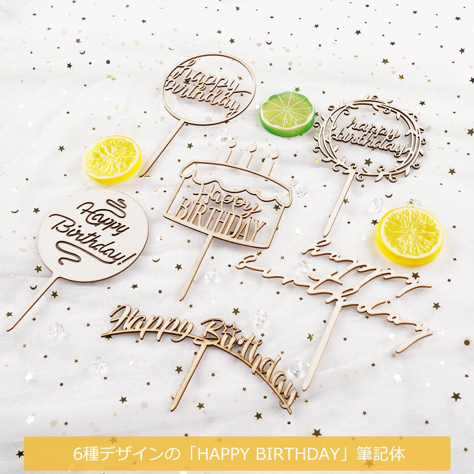 6枚セットの「HAPPY BIRTHDAY」ケーキトッパーです。木製のケーキトッパーで、特別な誕生日のお祝いをおしゃれに演出しますささっと作ったケーキでも、トップに飾るだけで一気に華やかなケーキが出来上がり!ケーキトッパーでケーキの印象は大きく変わります!記念日や誕生日に飾るとパーティー気分が盛り上がります。