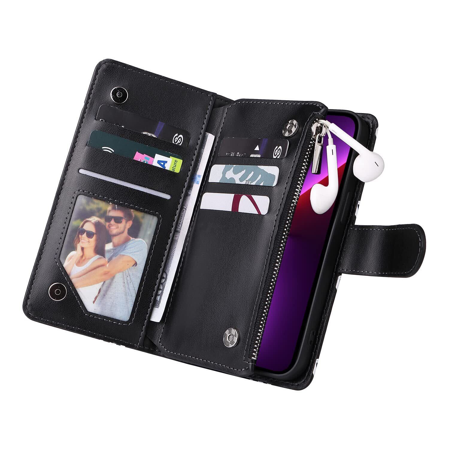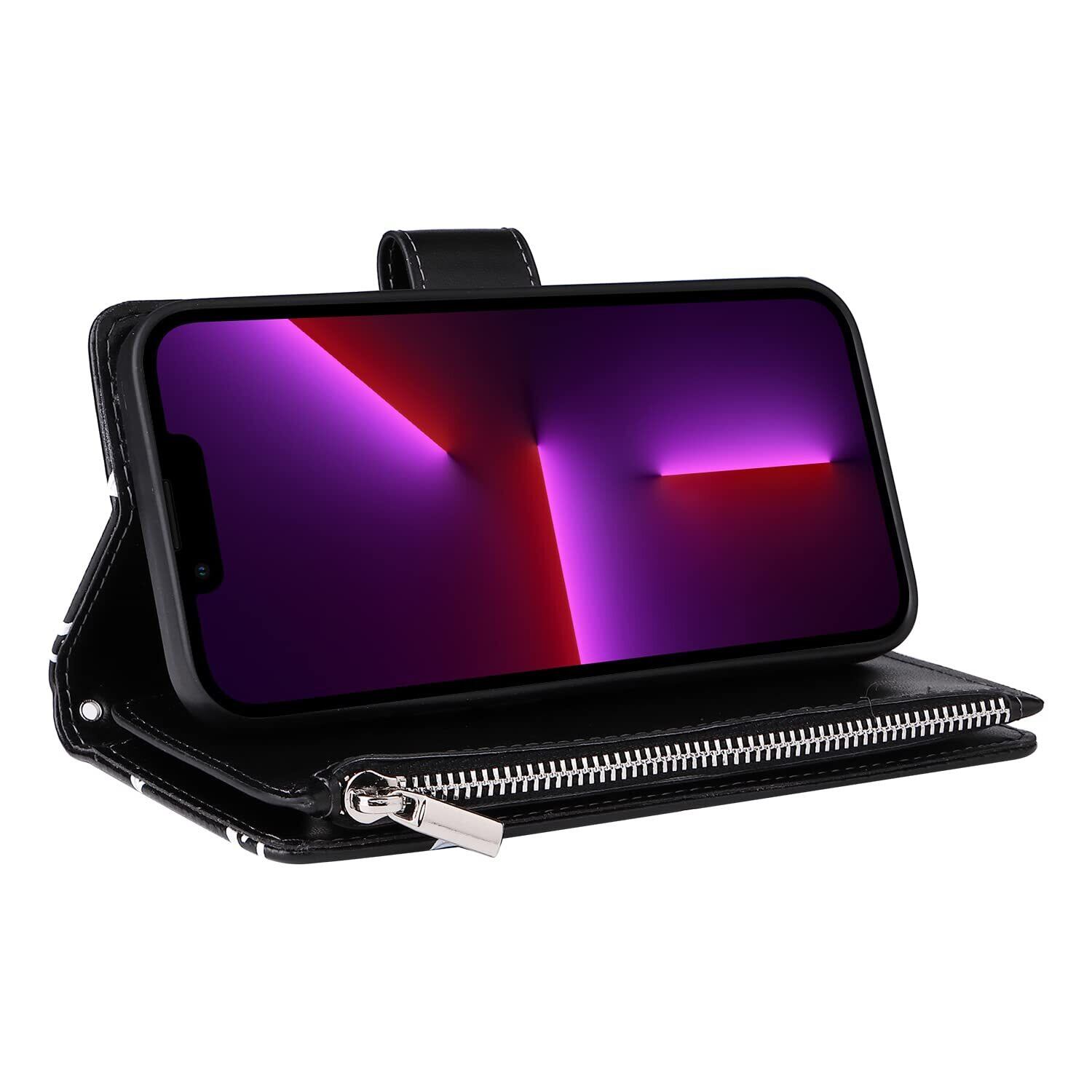 QLTYPRI iPhone 13 用 ケース 財布型 手帳型 ケース 可愛い 愛の心 ハート シンプ プリント ファスナー ストラップ付き 保護ケース ベルト式 ポーチ型 軽量 耐汚れ 耐衝撃 携帯カバー6.1インチ - ブラック