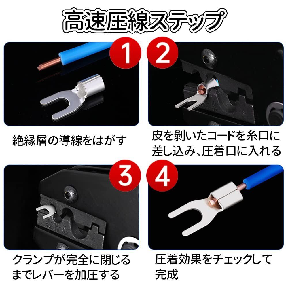 【使用簡単】1.一端が剥がされている。2.ターミナルに入れて修正。3.ペンチを自動的に跳ね返るまで押します。4.完全なターミナル。