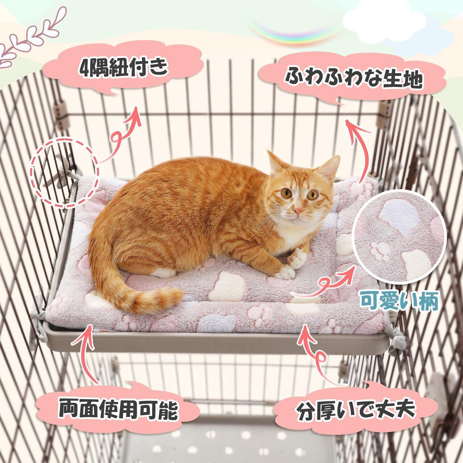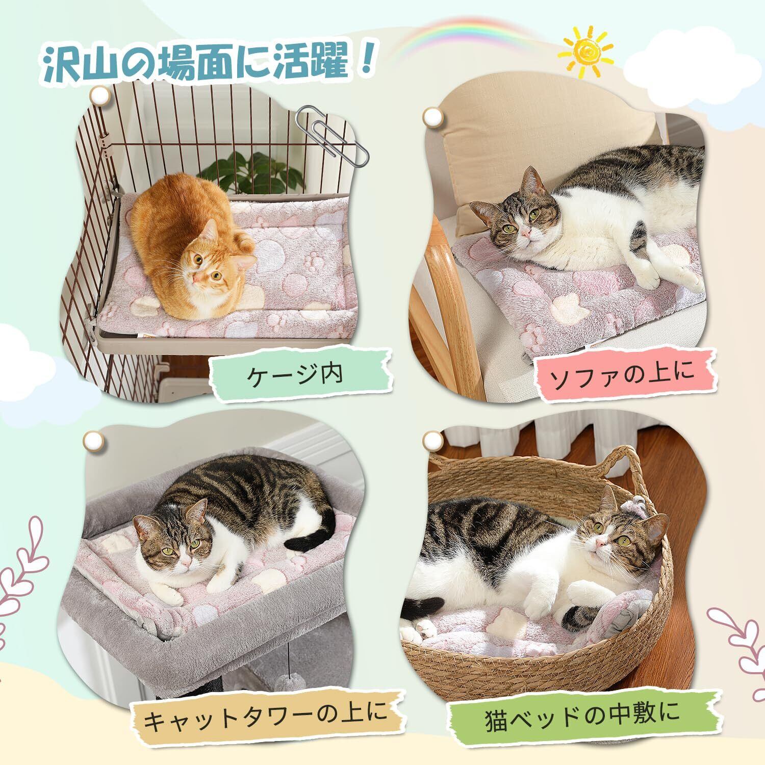 【沢山の場面に活躍】ケージ、ソファ、キャットタワー、猫ベッドの中敷など、さまざまな場所に設置可能です!どこでも猫に心地よいスペースを確保できます!