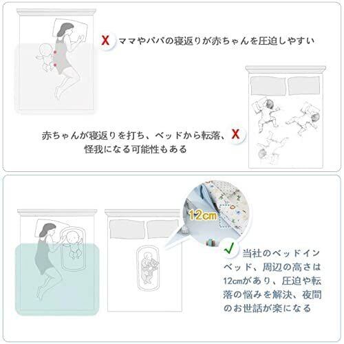 【安全性を備えるベッドインベッド】ベビーベッドのガードレールは12cmの高さで、赤ちゃんが乗り越えたり、床に転んだりするのを防ぐことができます。赤ちゃんが親と同じベッドにいても、防圧隔離効用があるので、熟睡中の親が赤ちゃんを圧迫するのも防げ、赤ちゃんと親を安心に寝付きくれます。