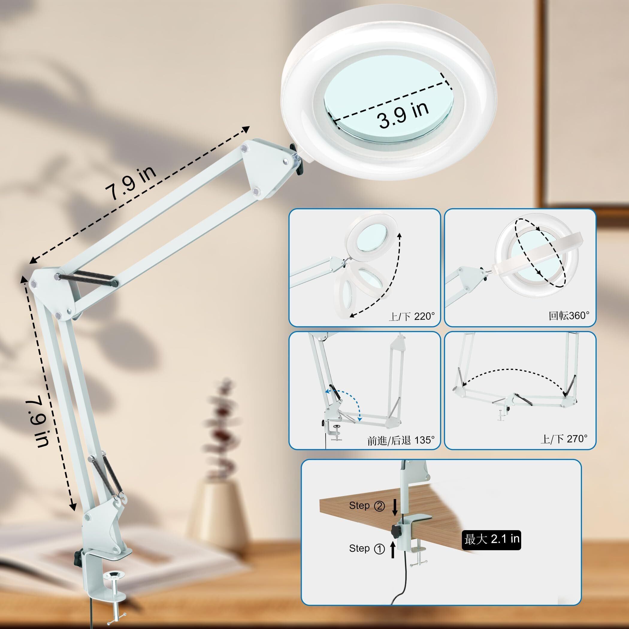 【360°曲がるスワンネックと頑丈なクリップボディ】このLED拡大鏡は、360°柔軟に調整できる40cmの長いグースネックを備えています。音を立てずに任意の位置に曲げたり回したりできるため、ランプが欲しい部分を明確に照らすことができます。また、保護パッド付きの頑丈な金属製クランプにより、ランプが転倒することはありません