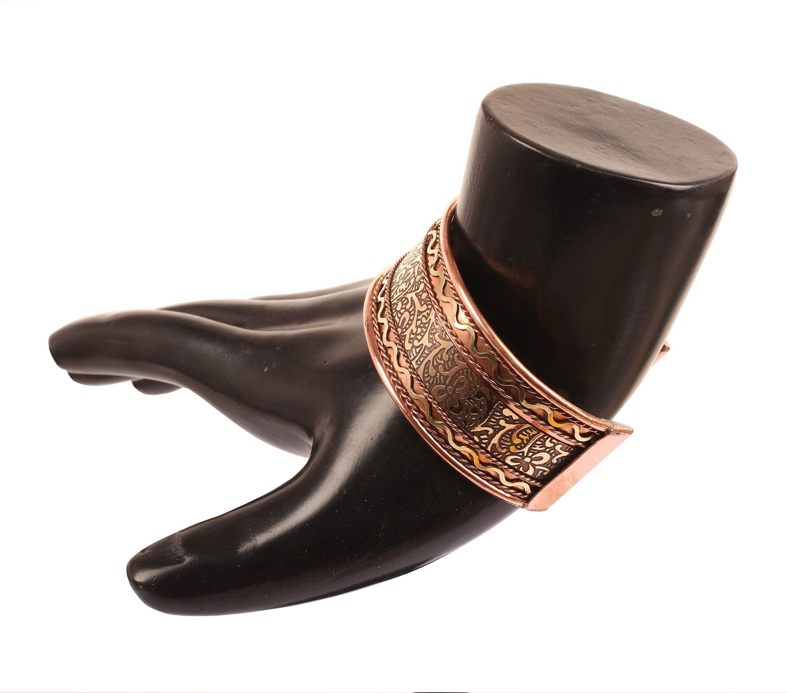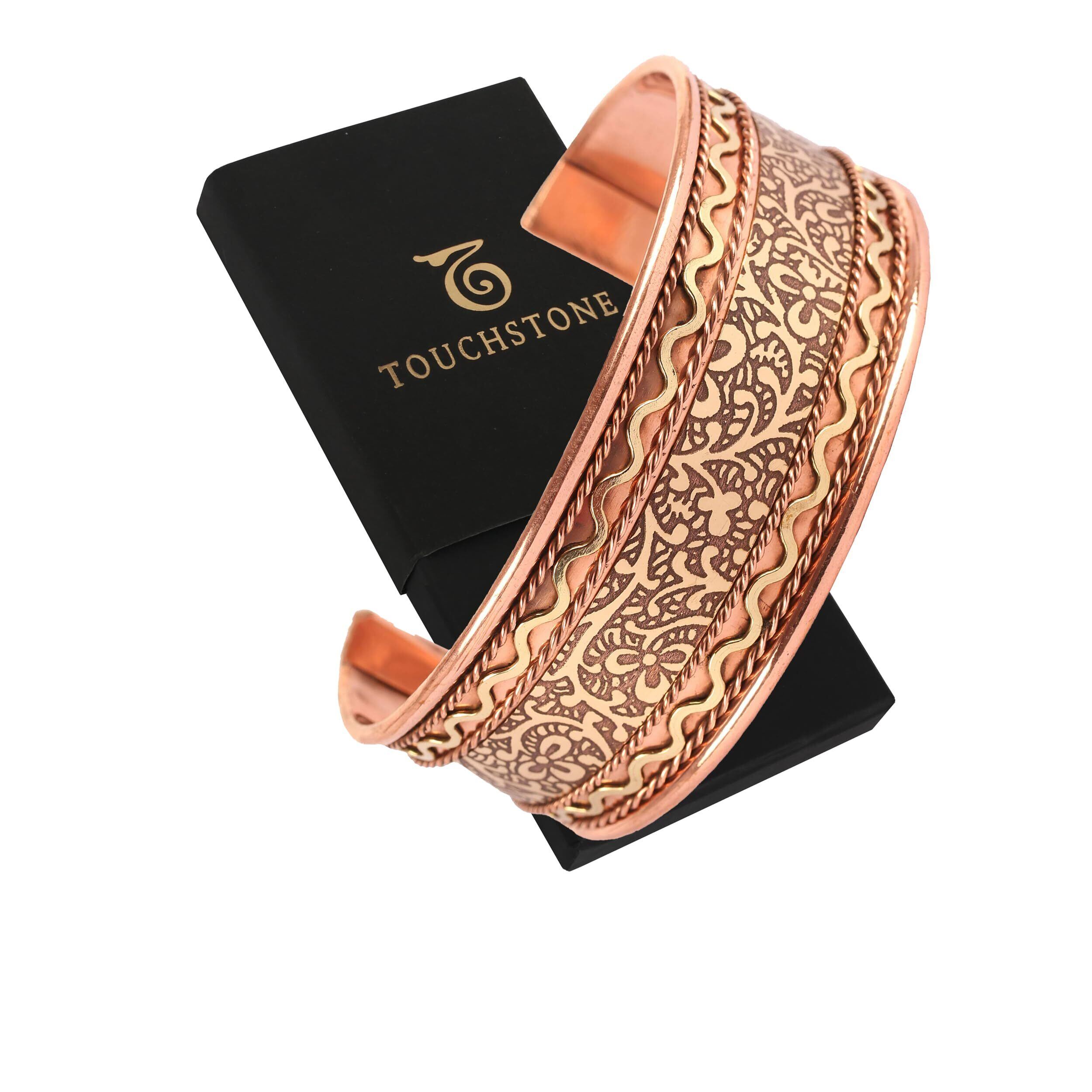 Touchstone銅ヒーリングブレスレットチベットスタイル。固体で高いゲージの純銅で鍛造された手。美しいエンボスデザイン。美しいデザインと細部への注意。世代を通して継承されたテクニックがあるインドの農村職人によって手作りされています。一生を続けます。