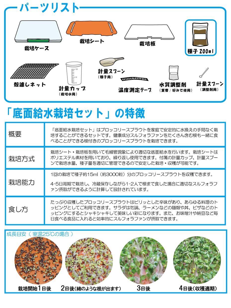 巣ごもり生活でも、毎日すくすく成長するブロッコリースプラウトは癒しと健康を与えてくれます。「底面給水栽培セット」が付属し、子供でも誰でも簡単に4-5日間隔で収穫できる家庭菜園を楽しめます。