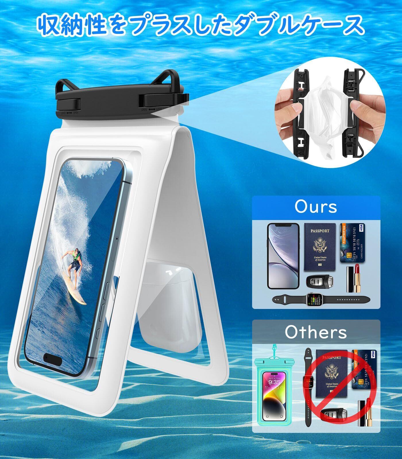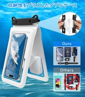 「収納性にプラスしたダブルケース仕様」スマホを装着するケース以外にもう一つのケースを設けてあり、同じくスマホも収納できる他、貴重品のクレジットカード、現金、鍵などの小物もスマホと共に身元に保管できるダブルケース仕様に仕上がっております。貴重品の紛失に心配いらなくなり、より快く水遊びをお楽しみいただけます。