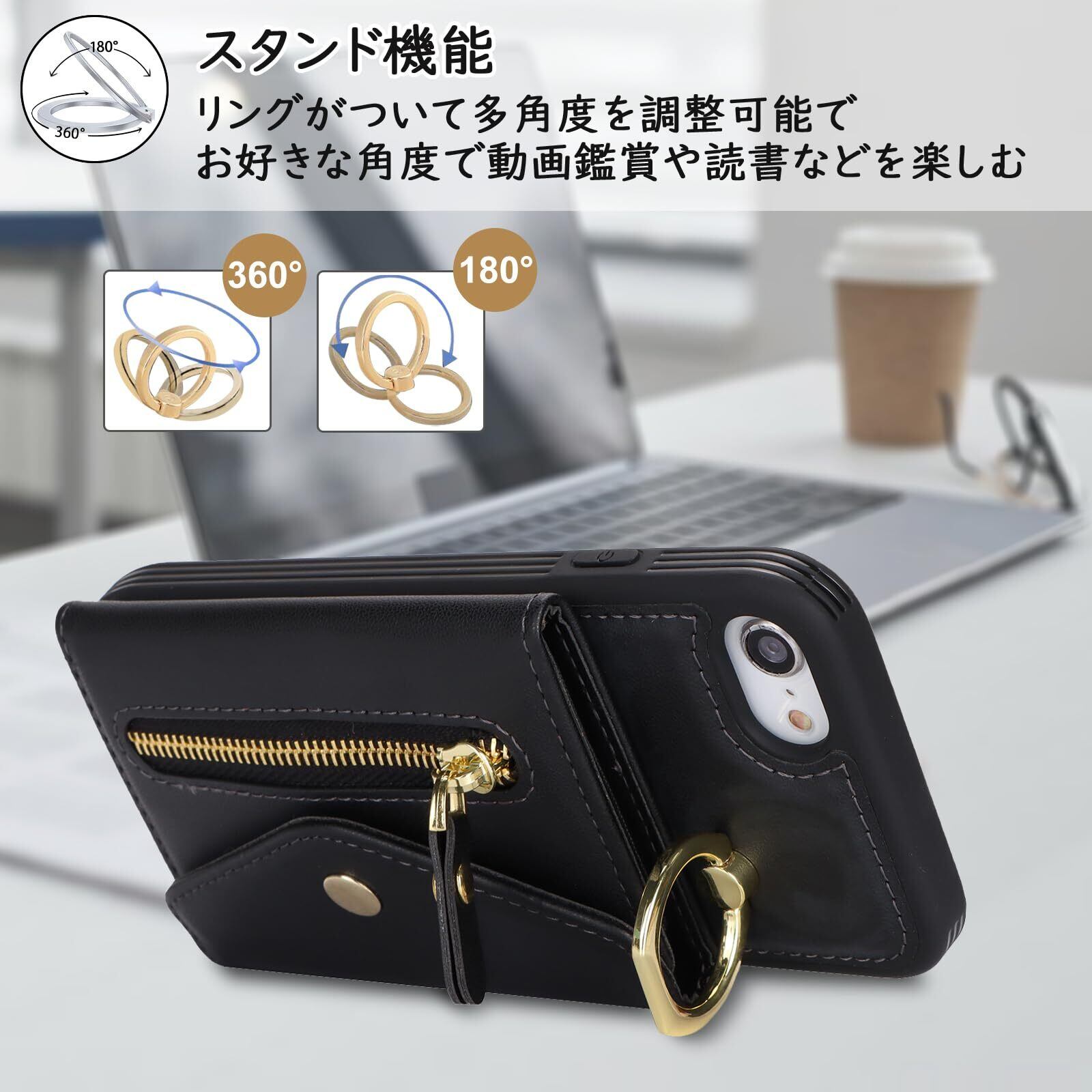 【Hamany】 iphone se ケース オシャレ ショルダー iphonese第3世代 ケース カード収納 大容量 iphone8 ケース 手帳型 リング付き スマホカバー 耐衝撃 全面保護 スタンド機能 iphone7ケース 肩掛け 斜めかけ カバー -ブラック