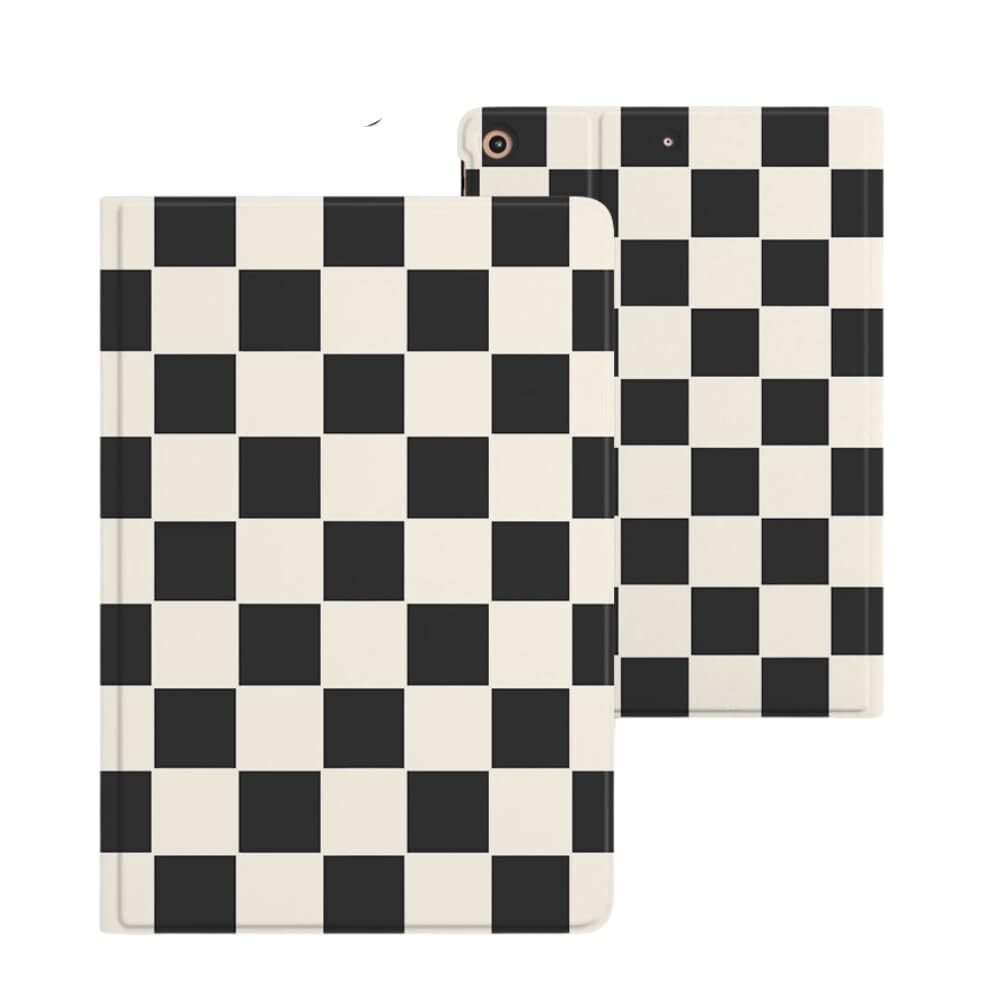モノトーンでお洒落な市松模様柄のiPadmini用ケースですペンシル収納付角度調整2段オートスリープウェイク機能付