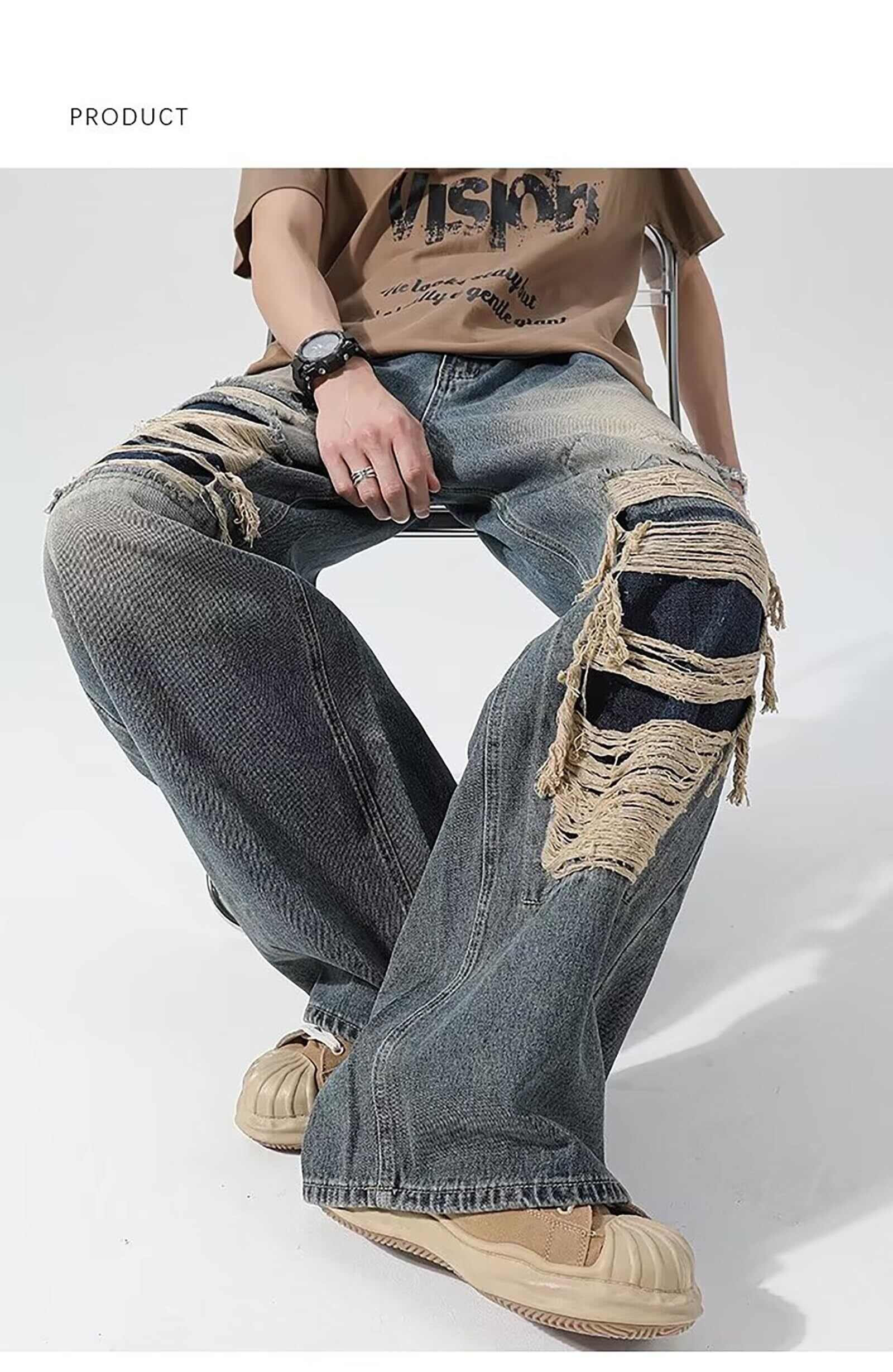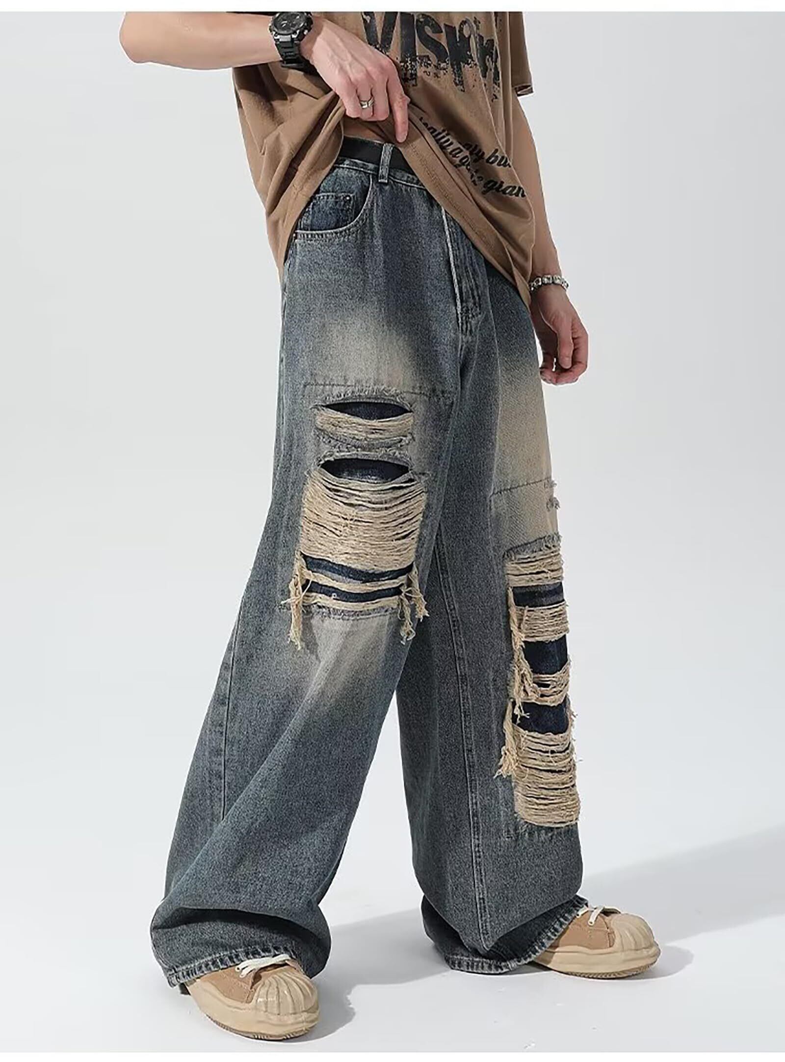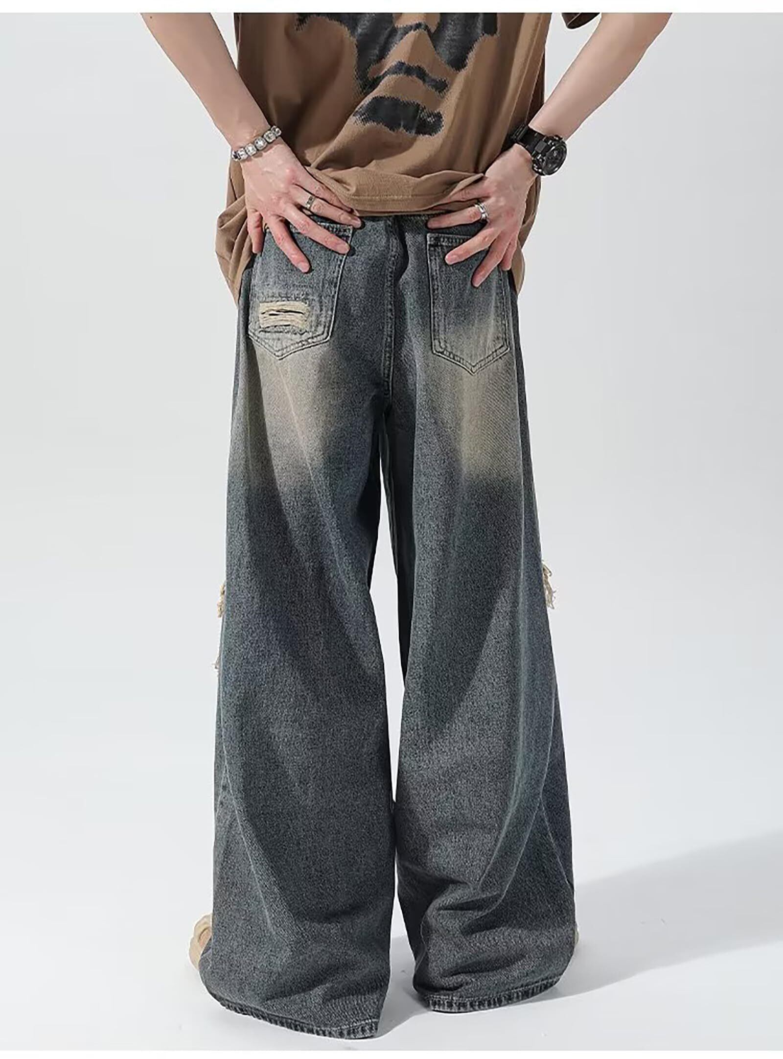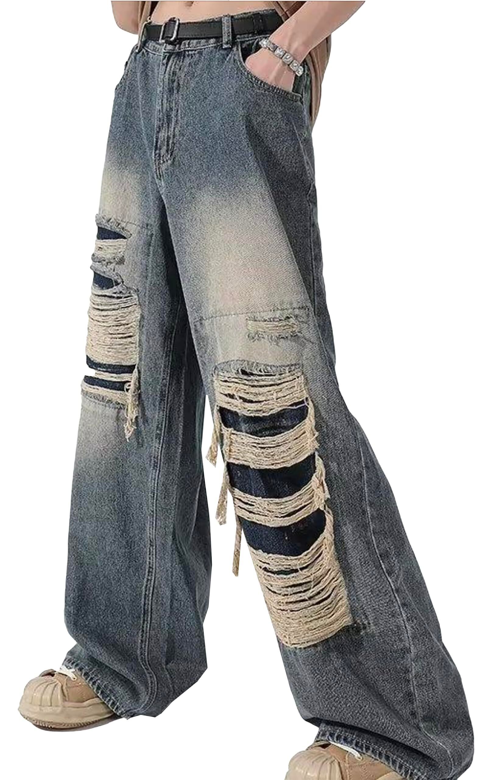 [MMTYRM] デニム パンツ メンズ ワイドパンツ ゆったりロングパンツ ストレッチ ガチョウパンツ おしゃれ ジーンズ gパン ダメージ加工 メンズ 大きいサイズ ロング デニムパンツ