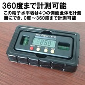 サイズ:約100mm 重量:約60g 材質:ABS樹脂 電源:3VCR2032×2個(電池別売) 角度測定:4×90度 測定単位:0.1度、誤差:0.3度以内 仕様:マグネット付、気泡管付 使用可能温度:0-40度 カラー:ブラック ※モニターの環境等により、色の見え方に若干差が生じる場合がございます。