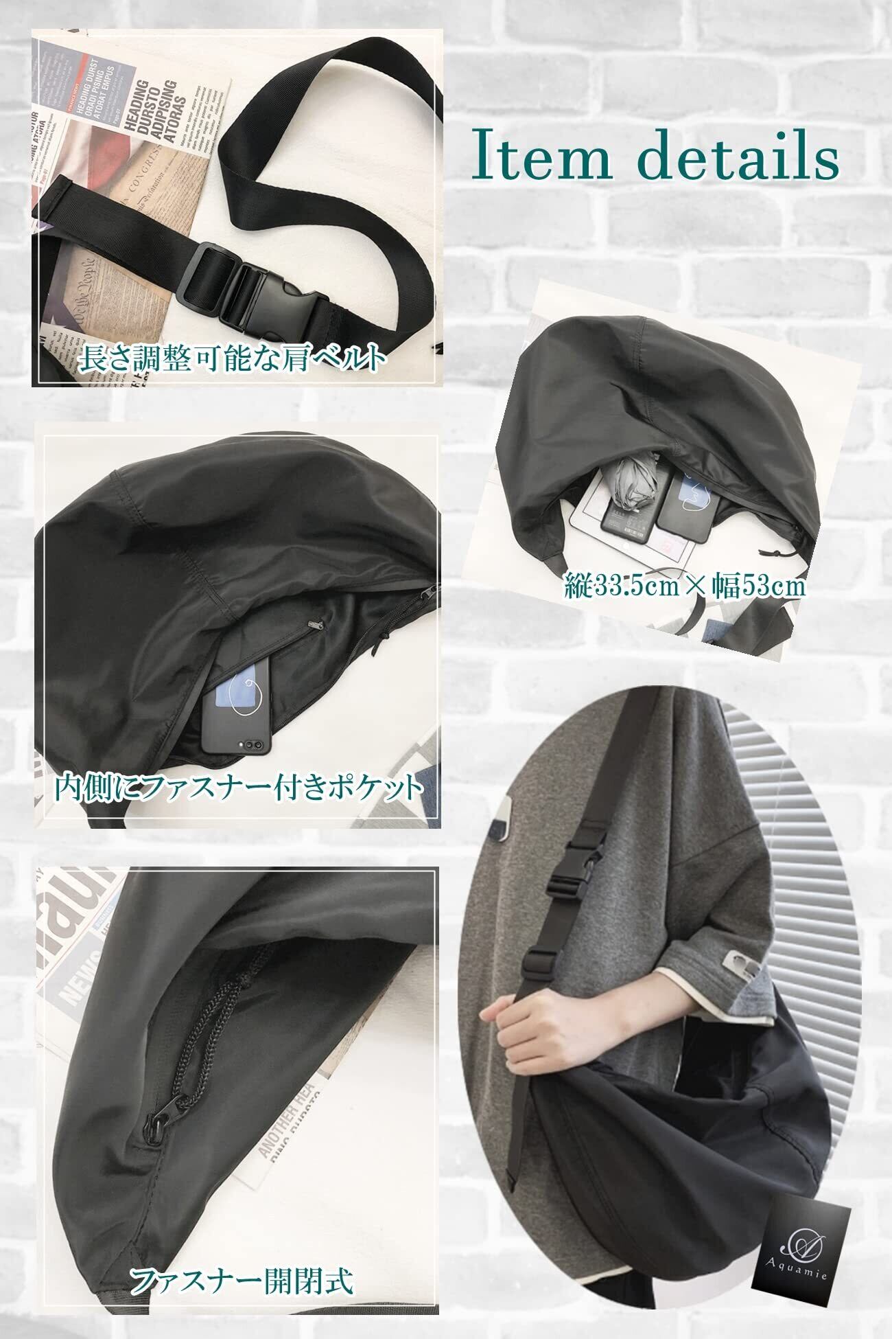 カラー:ベージュホワイト/アーミーグリーン/ブラック(黒)、平置きサイズ:縦33.5cm/幅53cm/マチ1cm/ショルダーベルト幅3.7cm、長さの調整可能で最長82cm程度/ファスナーの長さ59cm/バッグ重量(約):200g