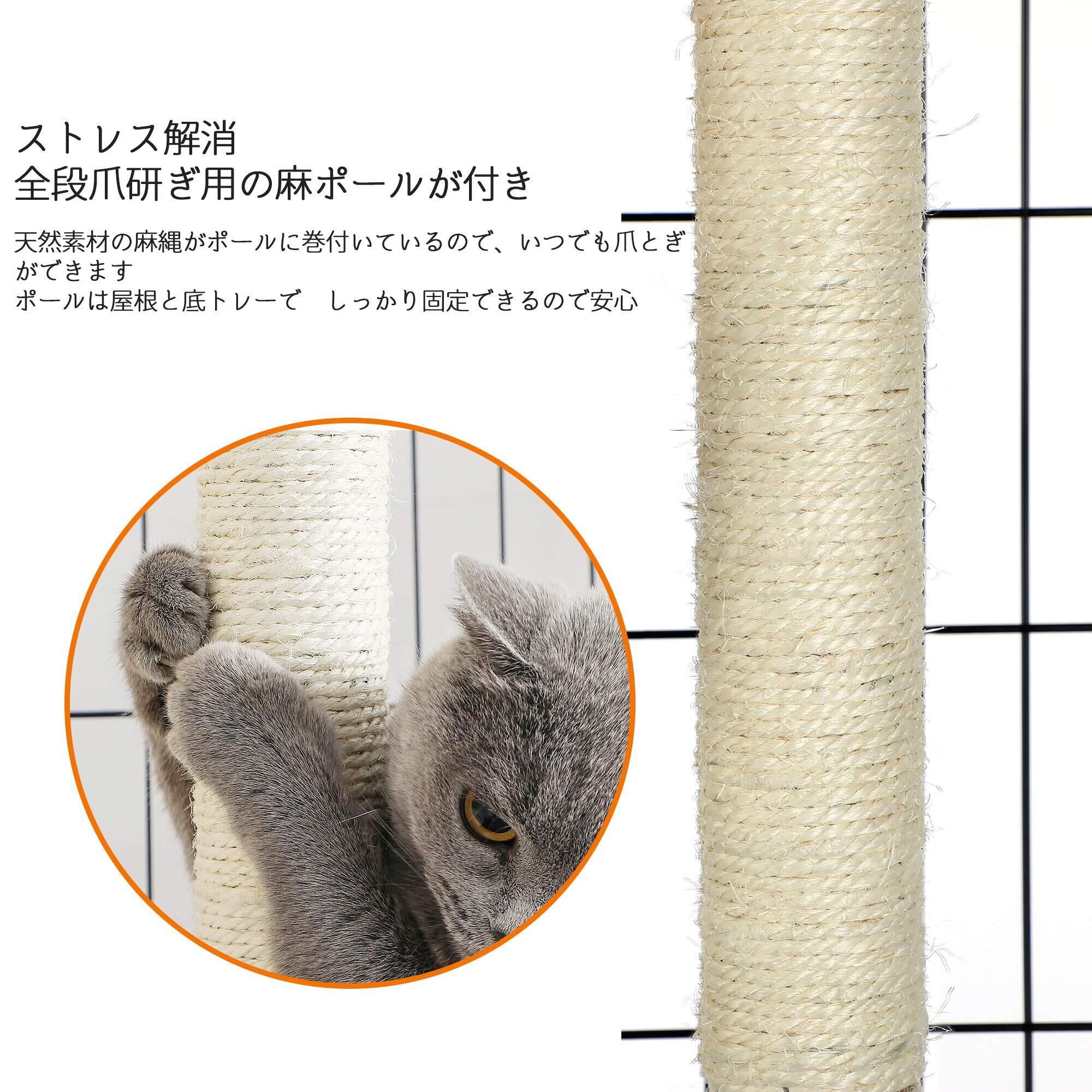 全段爪研ぎ用ポール:天然素材の麻縄がポールに巻付いているので、いつでもストレス解消できます。ポールは屋根と底トレーでしっかり固定できるので安心です