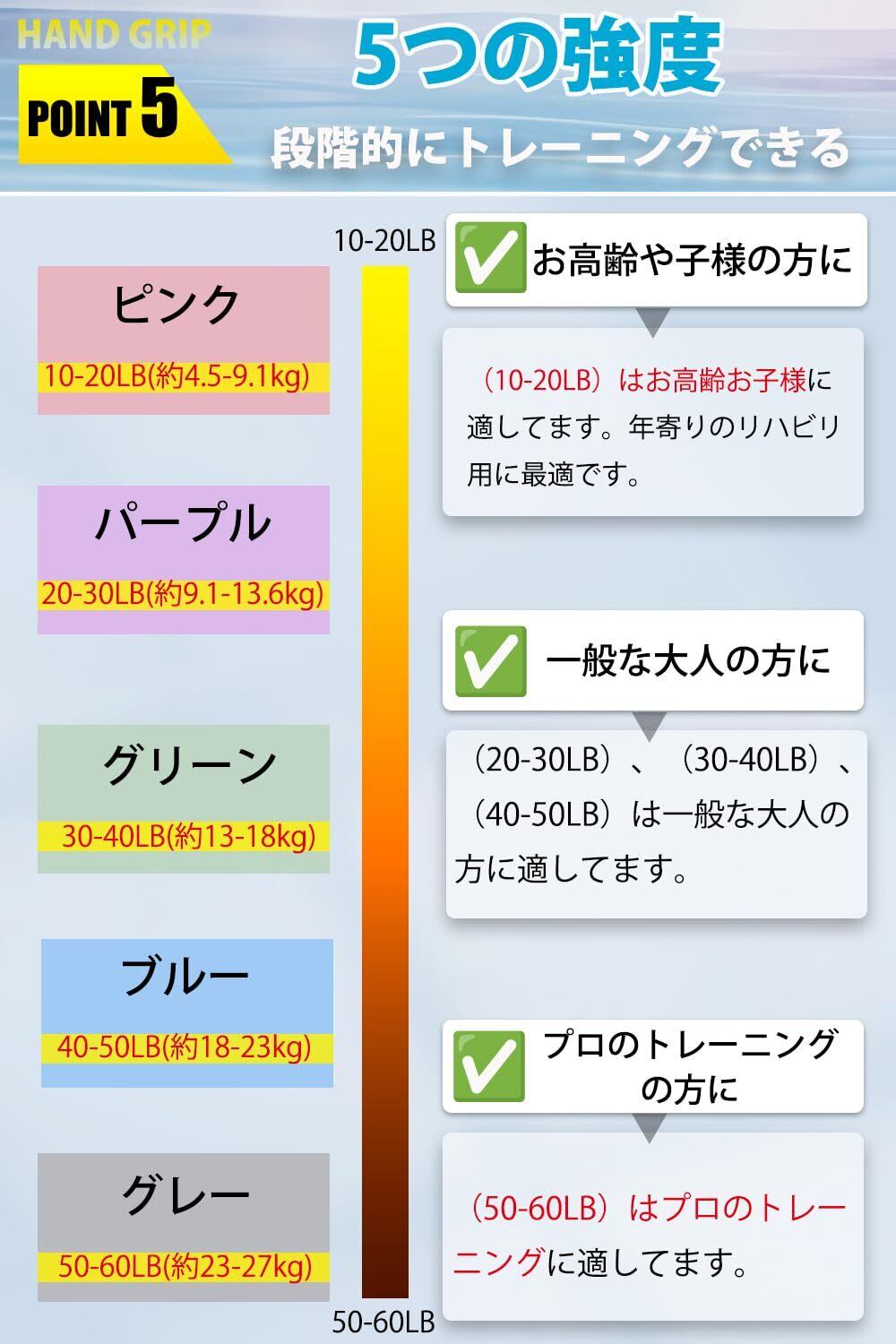 【5つの強度で段階的にトレーニング】ピンク(10-20LB)、パープル(20-30LB)、グリーン(30-40LB)、ブルー(40-50LB)グレー、(50-60LB)。(10-20LB)はお高齢お子様に適してます。年寄りのリハビリ用に最適です。(50-60LB)はプロのトレーニングに適してます。